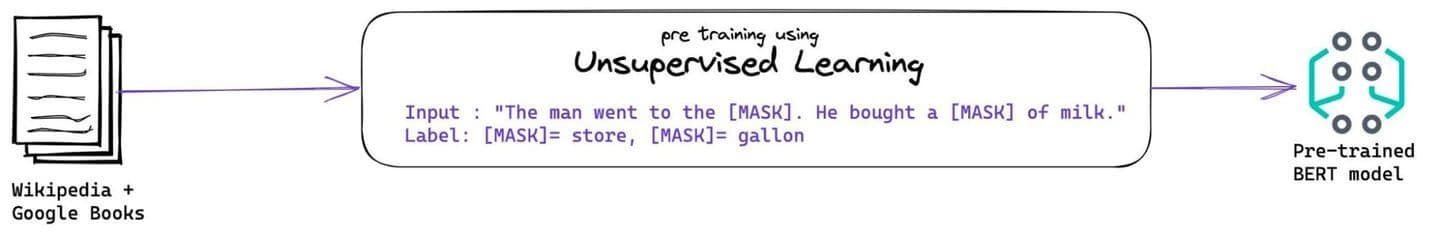 Using a huge corpus of text, the model learns semantic knowledge by training on unsupervised tasks (like Masked Word Prediction or Next Sentence Prediction).