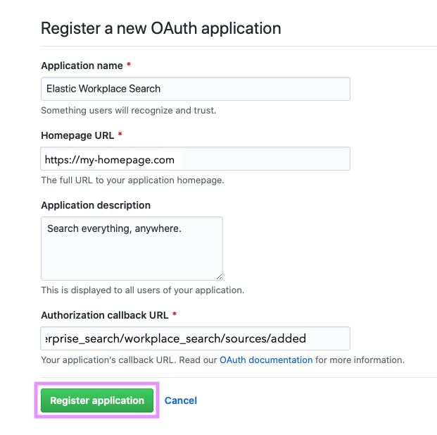 - Authorization callback URL: Add the Workplace Search OAuth redirect URL for your deployment.