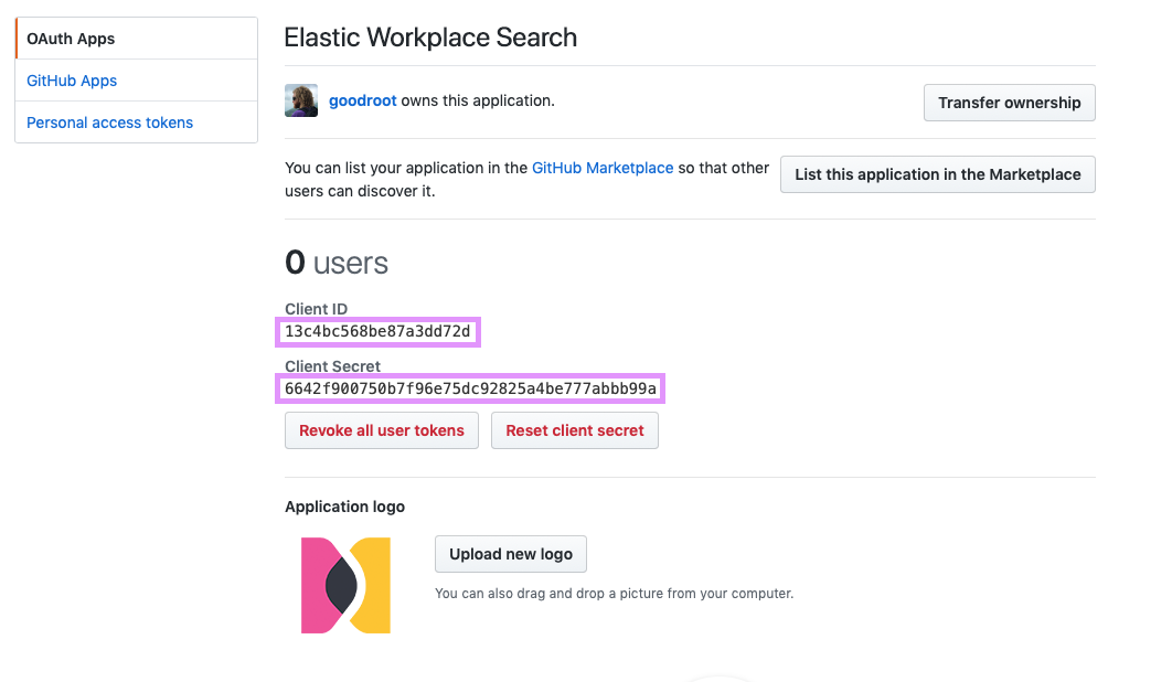 Step 6. From the Workplace Search administrative dashboard’s Sources area, locate GitHub and provide both the Client ID and Client Secret.