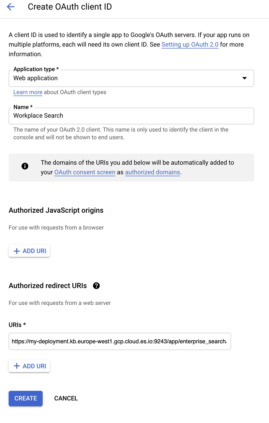 Authorized redirect URIs: The Workplace Search OAuth redirect URL for your deployment.