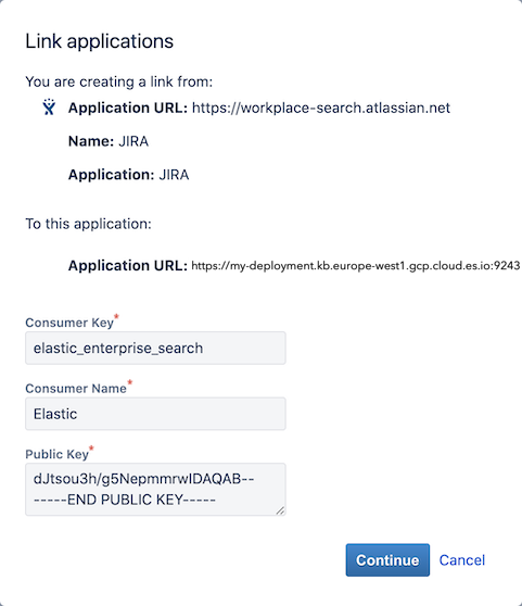 editStep 1. From the Workplace Search administrative dashboard’s Sources area, locate Jira Server and click Configure. You are presented with a Public Key and a Consumer Key. Copy these keys and keep them handy, as we’ll need them in just a second.