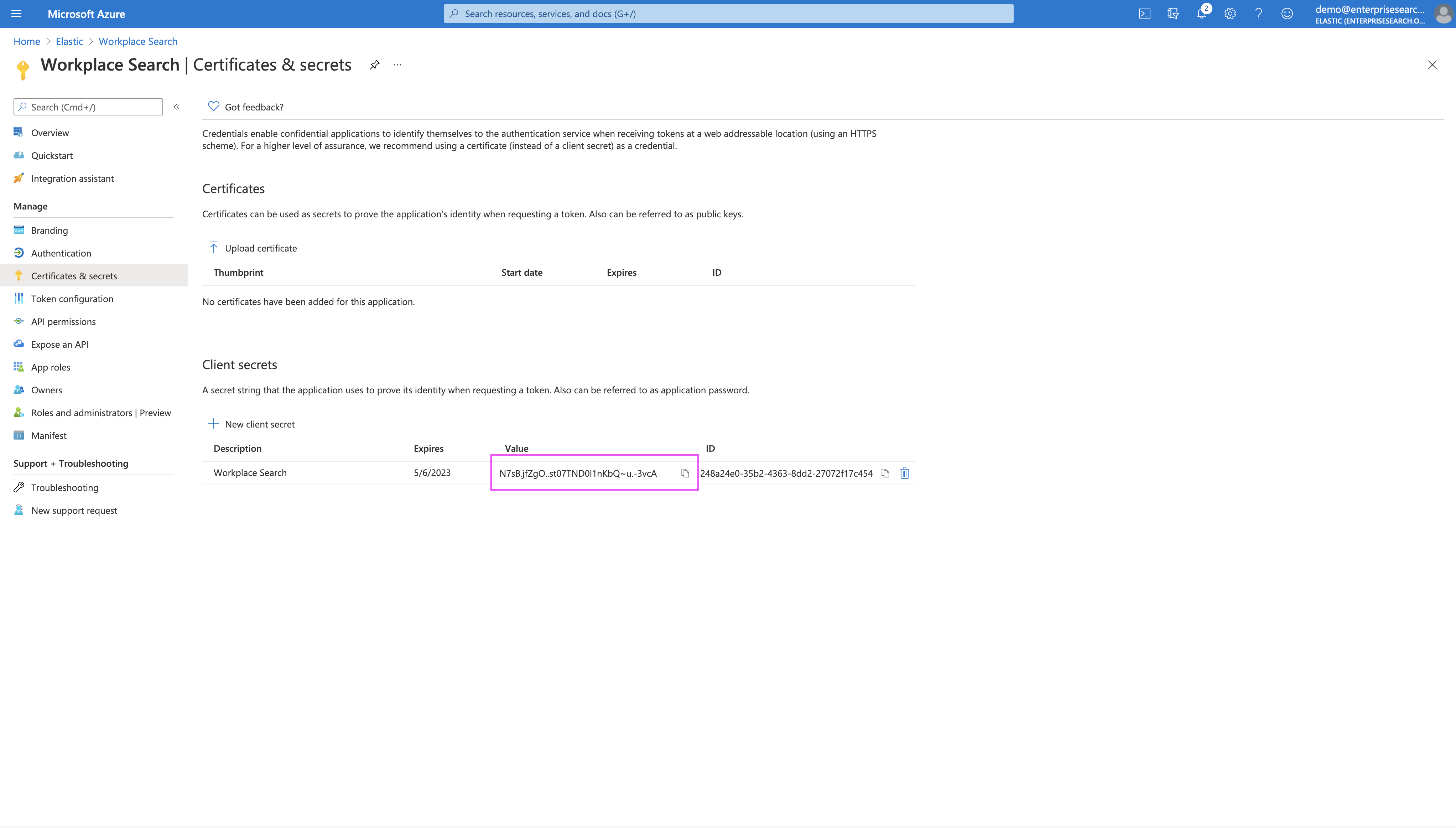 Step 9. Pick a name for your client secret (for example, Workplace Search). Select 24 months as the expiration date: