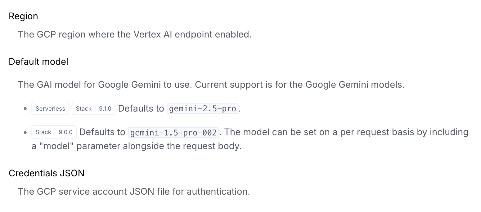 This might include labeling just one of multiple paragraphs, or one item in an ordered or unordered list. For example, on the Google Gemini Connector page, the default model is different depending on the deployment type and version of the Elastic Stack. These differences should be called out with their own applies_to badges.
