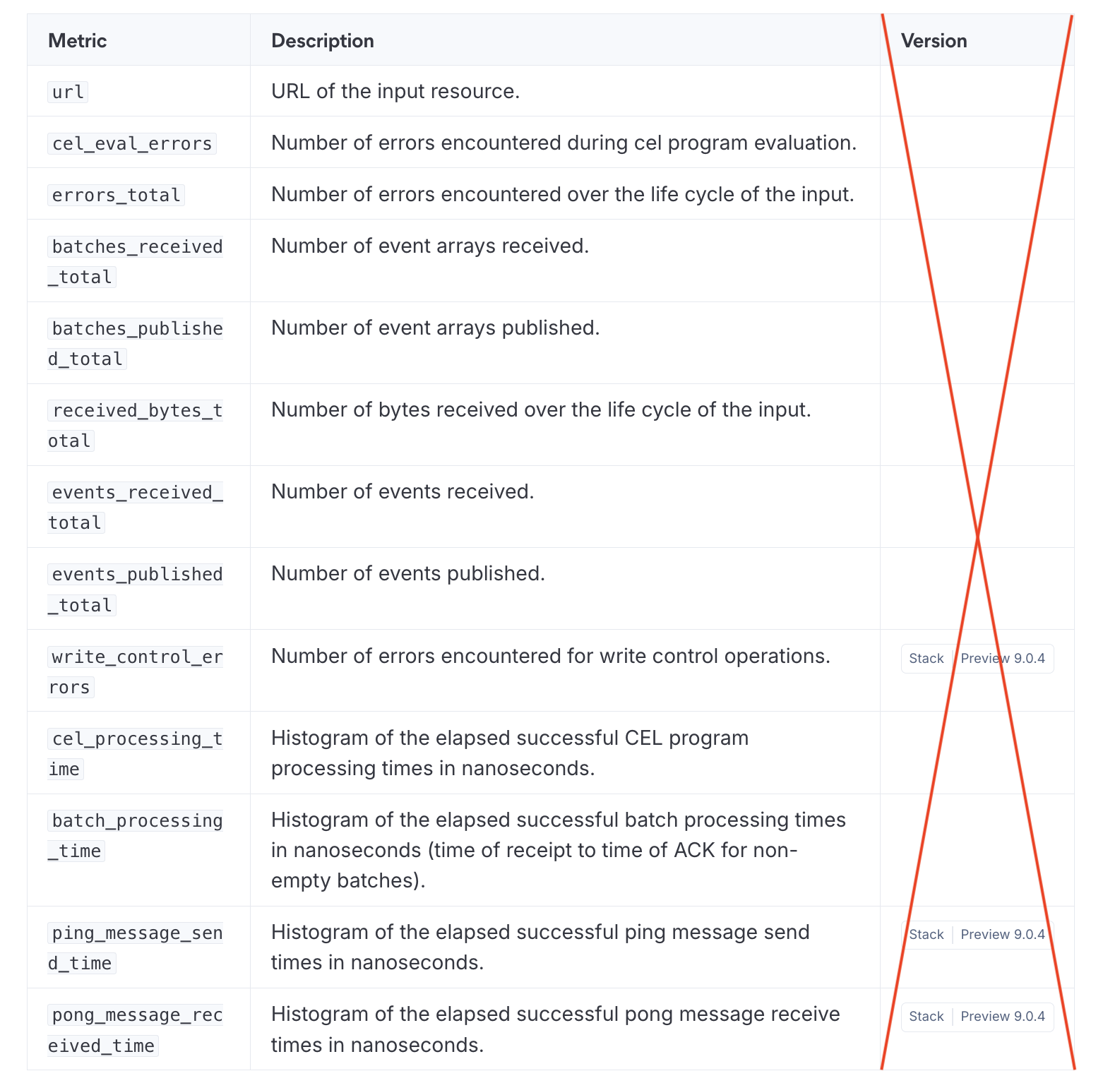 For example, the Streaming Input page includes a table that contains one setting per row and a new setting is added in 9.0.4.