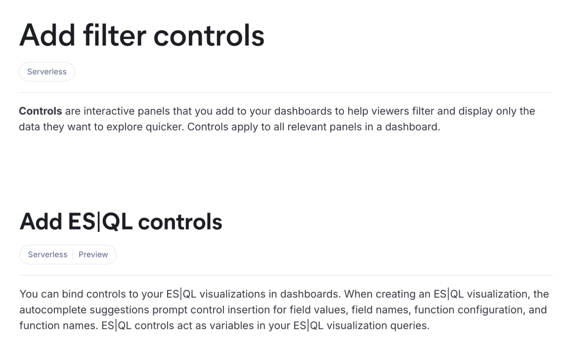 For example, on the Dashboard controls page we added content about new ES|QL controls functionality that was added to Serverless in preview.