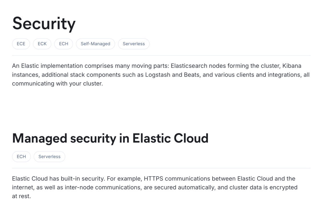 For example, the content on the Security page is generally applicable to all deployment types, but the first section only applies to Elastic Cloud Hosted and Serverless: