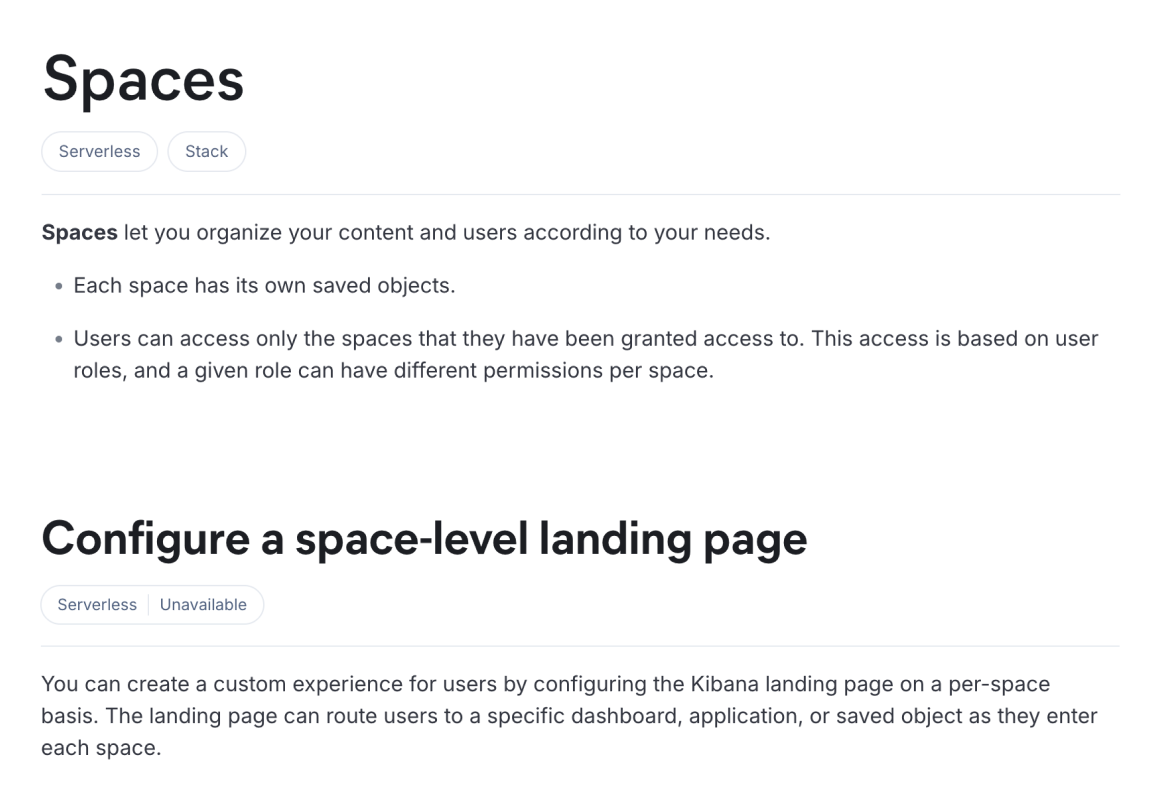 For example, if a whole page is generally applicable to Elastic Stack 9.0.0 and to Serverless, but one specific section isn’t applicable to Serverless. The content on the Spaces page is generally applicable to both Serverless and stateful, but one section only applies stateful: