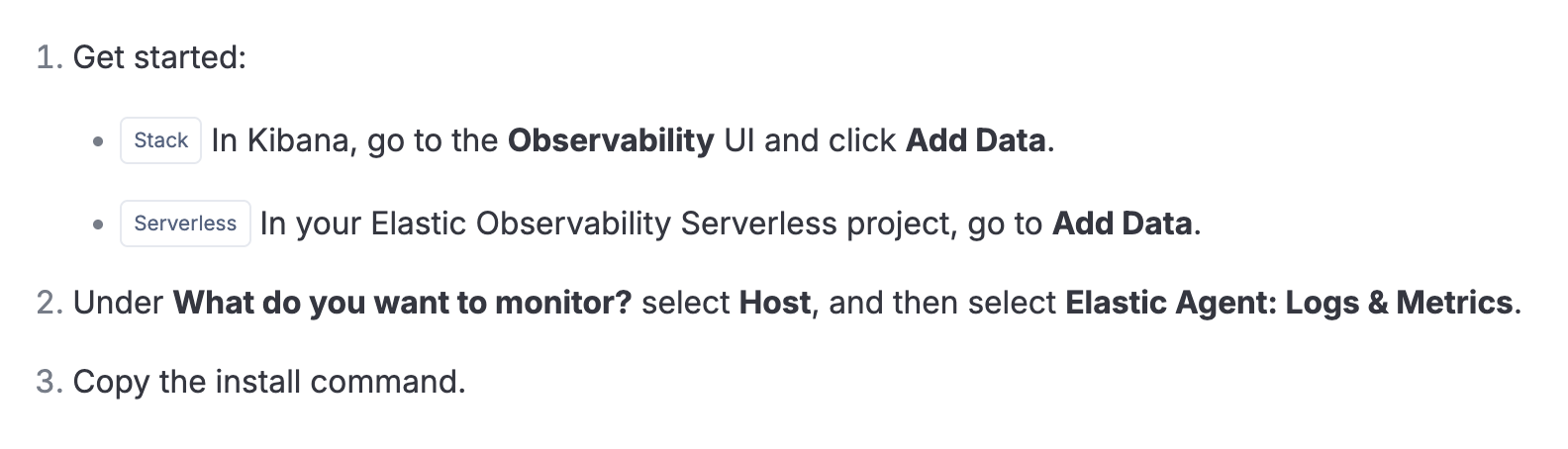 Example: On the Upstream OpenTelemetry Collectors and language SDKs page, we use tabs to show two different code blocks: one for Serverless and one for Elastic Stack (stateful).