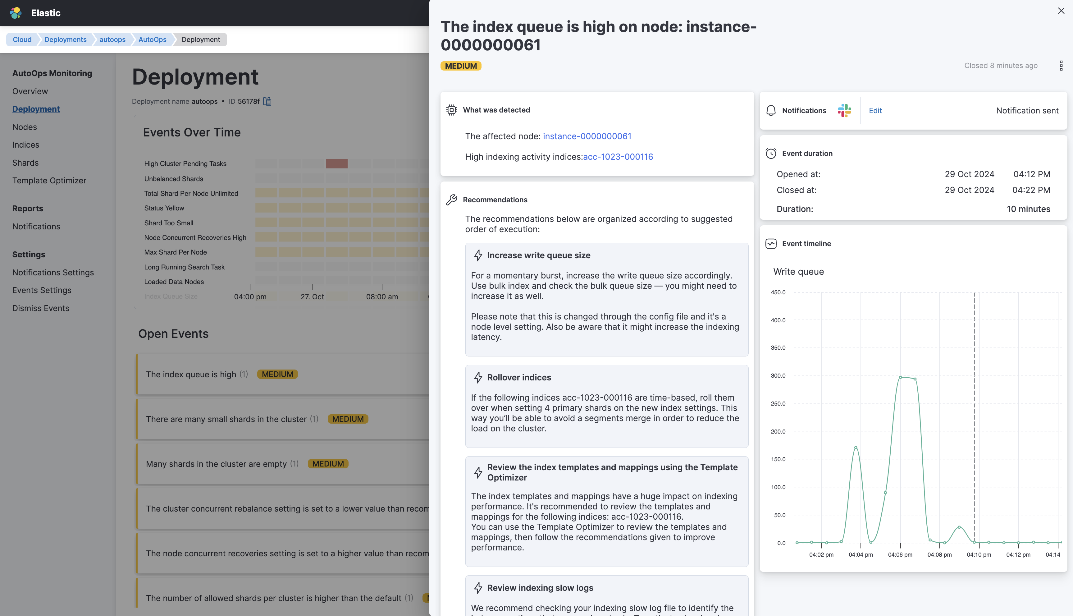 AutoOps continuously monitors your Elasticsearch deployments by sampling performance and health metrics at 10-second intervals. This high-frequency data collection allows AutoOps to rapidly detect and diagnose issues so you can get timely notifications and resolve issues faster.