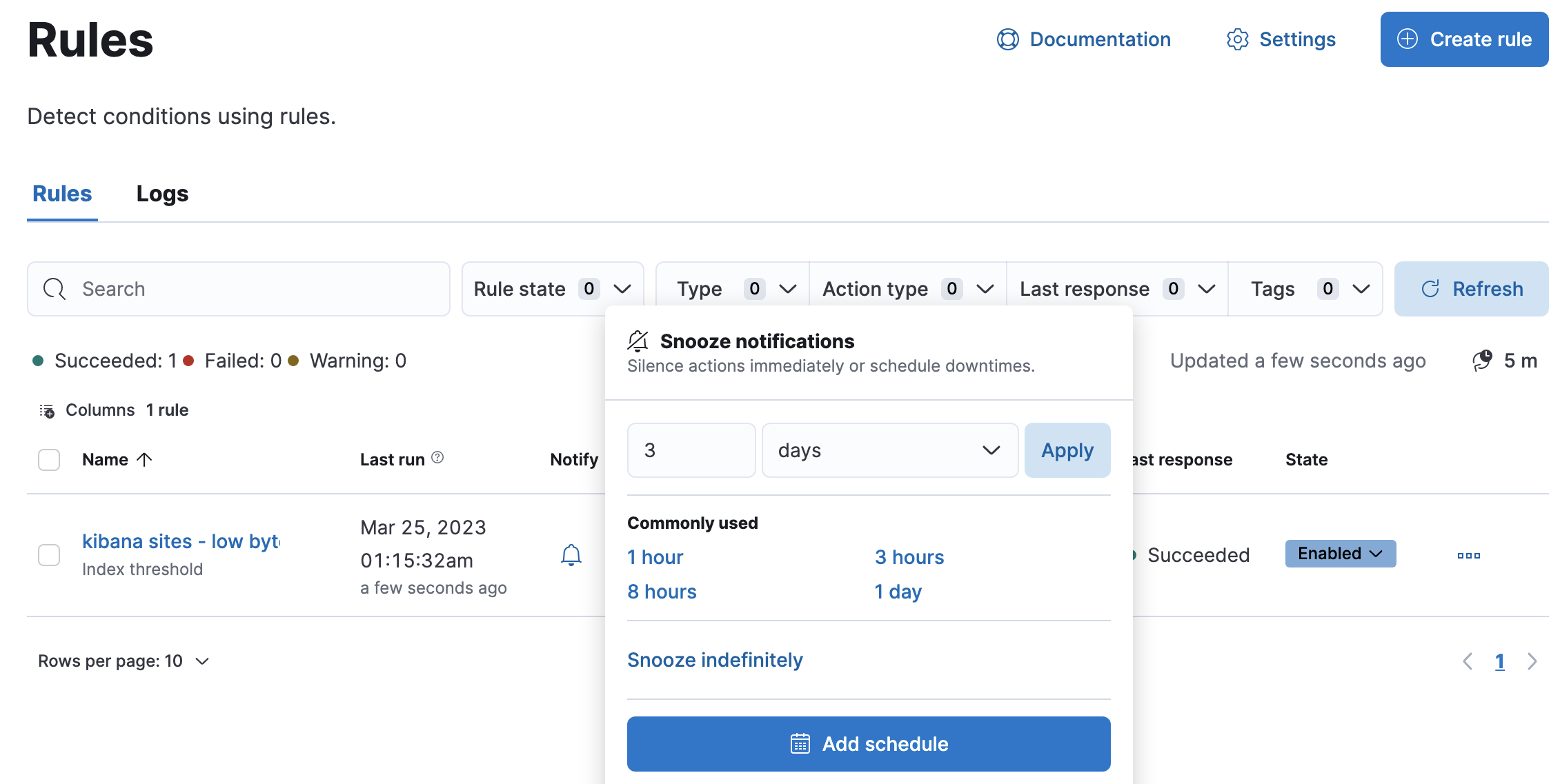 When you snooze a rule, the rule checks continue to run on a schedule but alerts will not generate actions. You can snooze for a specified period of time, indefinitely, or schedule single or recurring downtimes: