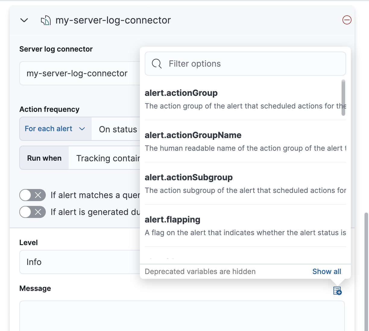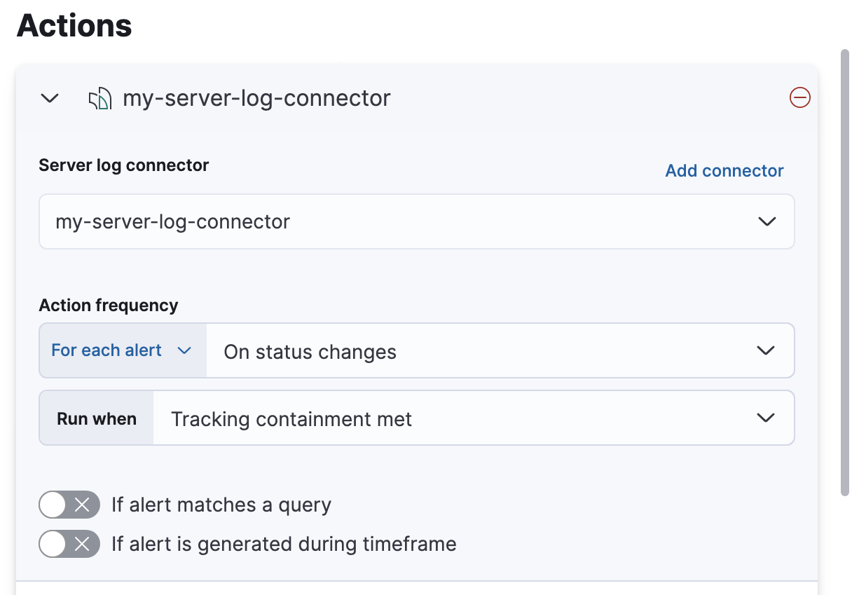 After you select a connector, you must set the action frequency. You can choose to create a summary of alerts on each check interval or on a custom interval. Alternatively, you can set the action frequency such that actions run for each alert. Choose how often the action runs (at each check interval, only when the alert status changes, or at a custom action interval). You must also choose an action group, which indicates whether the action runs when the containment condition is met or when an entity is no longer contained. Each connector supports a specific set of actions for each action group. For example: