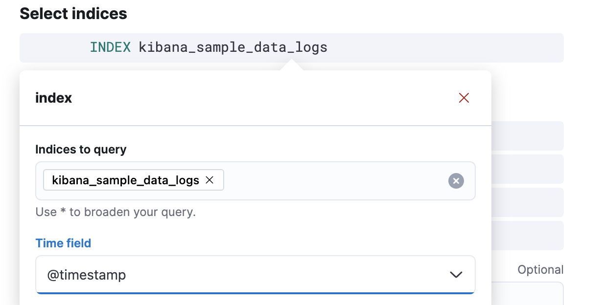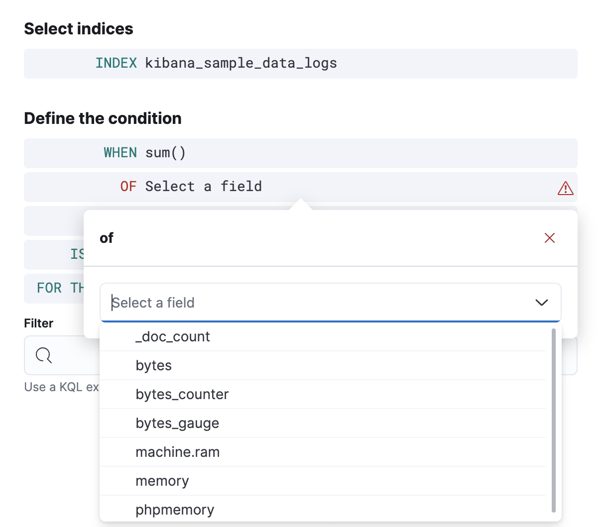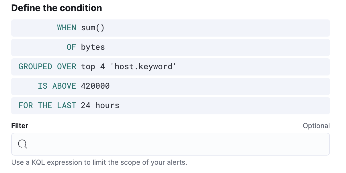 FOR THE LASTclause, specify a time window. It determines how far back to search for documents and uses the time field set in the index clause. - Optionally add a KQL expression to further refine the conditions that the rule detects.