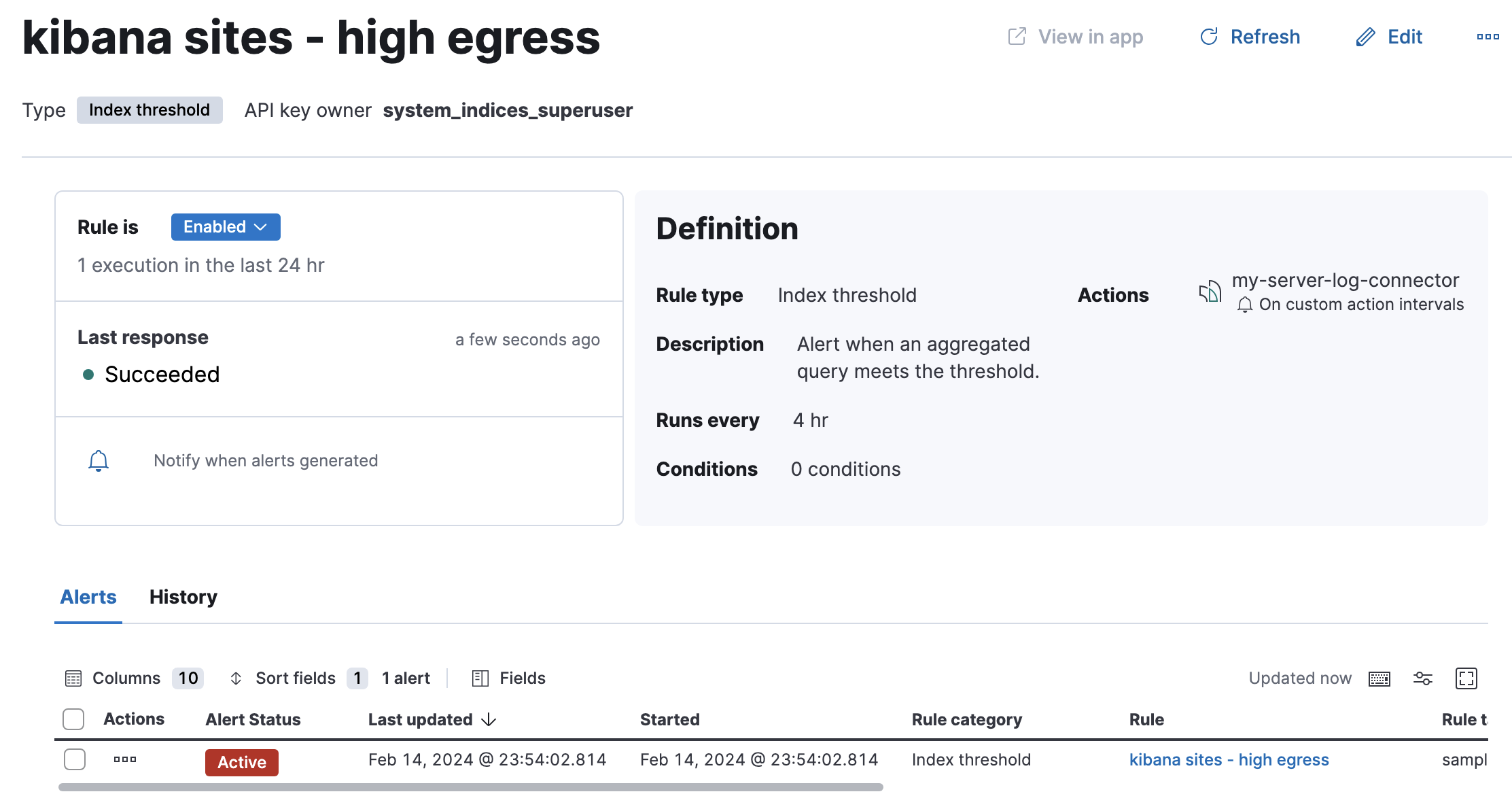 rule 'kibana sites - high egress' is active for group 'threshold met':