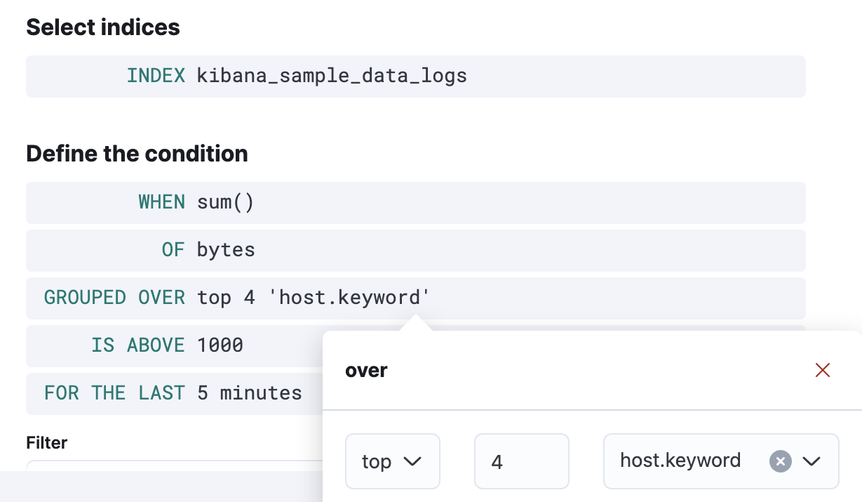 OVERorGROUPED OVERclause, specify whether the aggregation is applied over all documents or split into groups using a grouping field. If grouping is used, an alert will be created for each group when it exceeds the threshold. To limit the number of alerts on high cardinality fields, you must specify the number of groups to check against the threshold. Only the top groups are checked. - Choose a threshold value and a comparison operator (