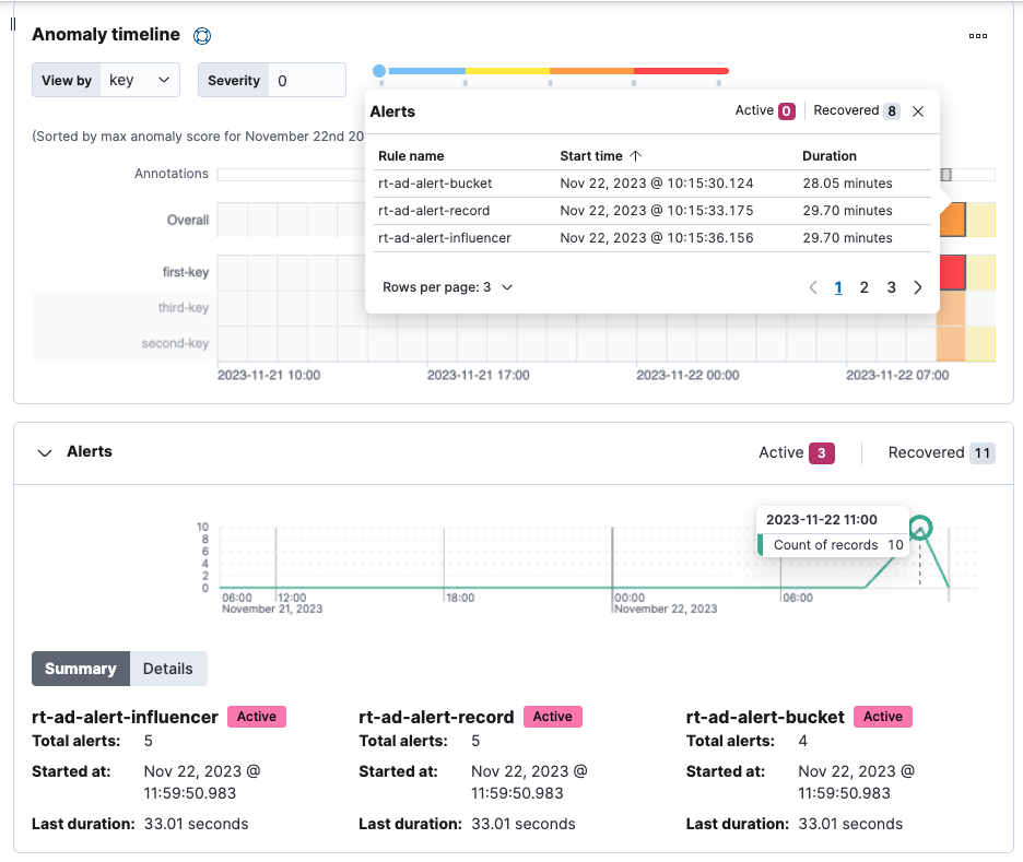 If you have Anomaly detection alert rules applied to an anomaly detection job and an alert has occured for the rule, you can view how the alert correlates with the anomaly detection results in the Anomaly Explorer by using the Anomaly timeline swimlane and the Alerts panel. The Alerts panel contains a line chart with the alerts count over time. The cursor on the line chart is in sync with the anomaly swimlane making it easier to review anomalous buckets with the spike produced by the alerts. The panel also contains aggregated information for each alert rule associated with the job selection such as the total number of active, recovered, and untracked alerts for the selected job and time range. An alert context menu is displayed when an anomaly swimlane cell is selected with alerts in the chosen time range. The context menu contains the alert counters for the selected time buckets.