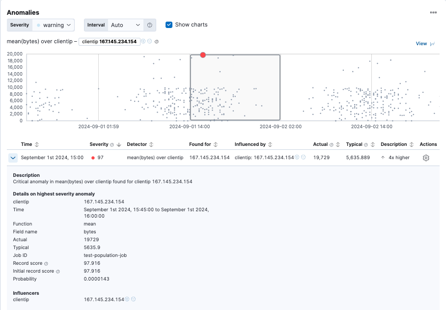 In this example, the client IP address 167.145.234.154 received a high volume of bytes on the date and time shown. This event is anomalous because the mean is four times higher than the expected behavior of the population.
