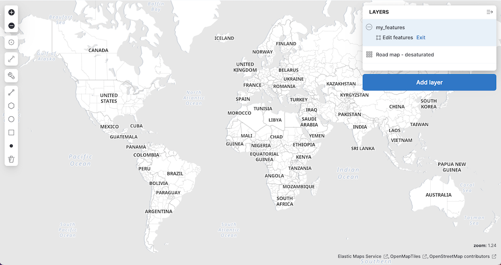 Upload features into Elasticsearch by drawing lines, polygons, circles, bounding boxes, and points in a map.