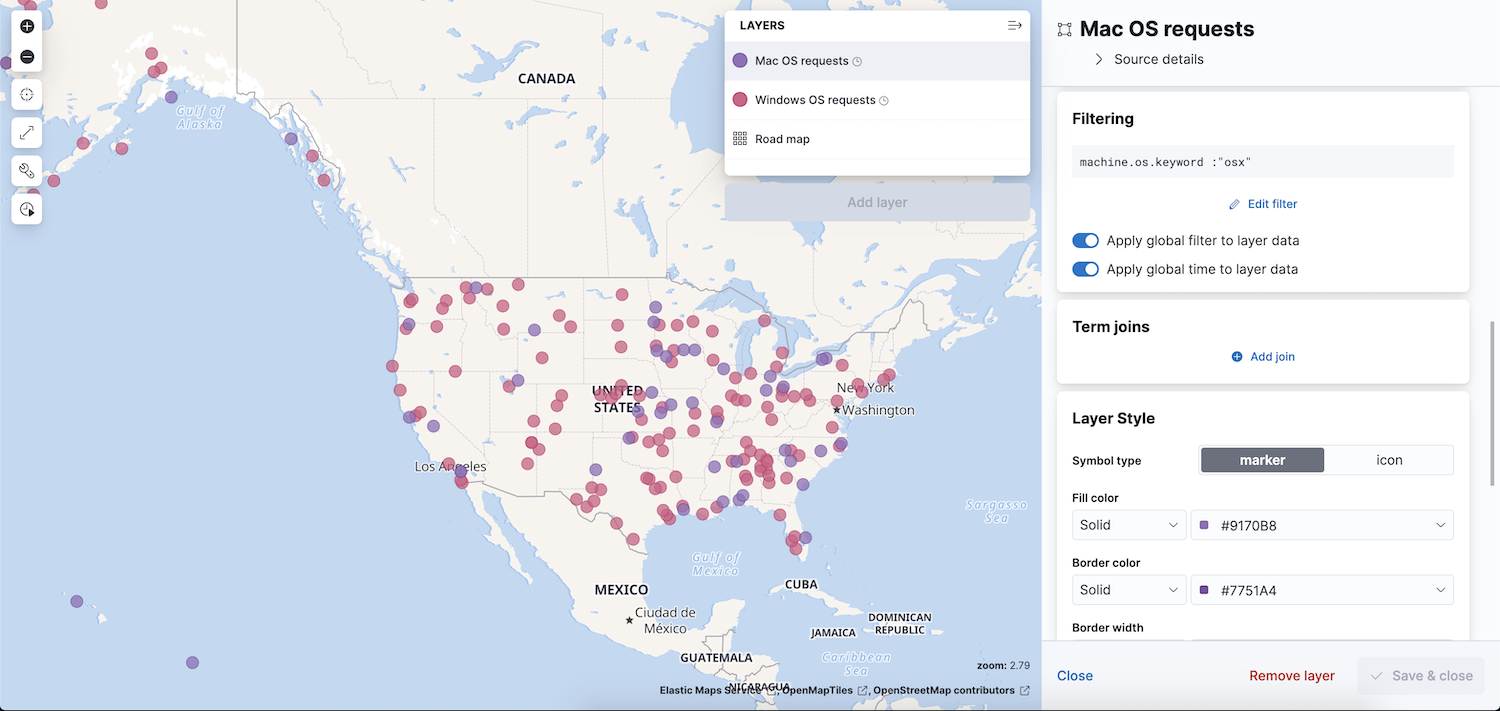 machine.os : osxso the layer only contains Mac OS requests. The fill color is a static value of green. - The Window OS requests layer applies the filter