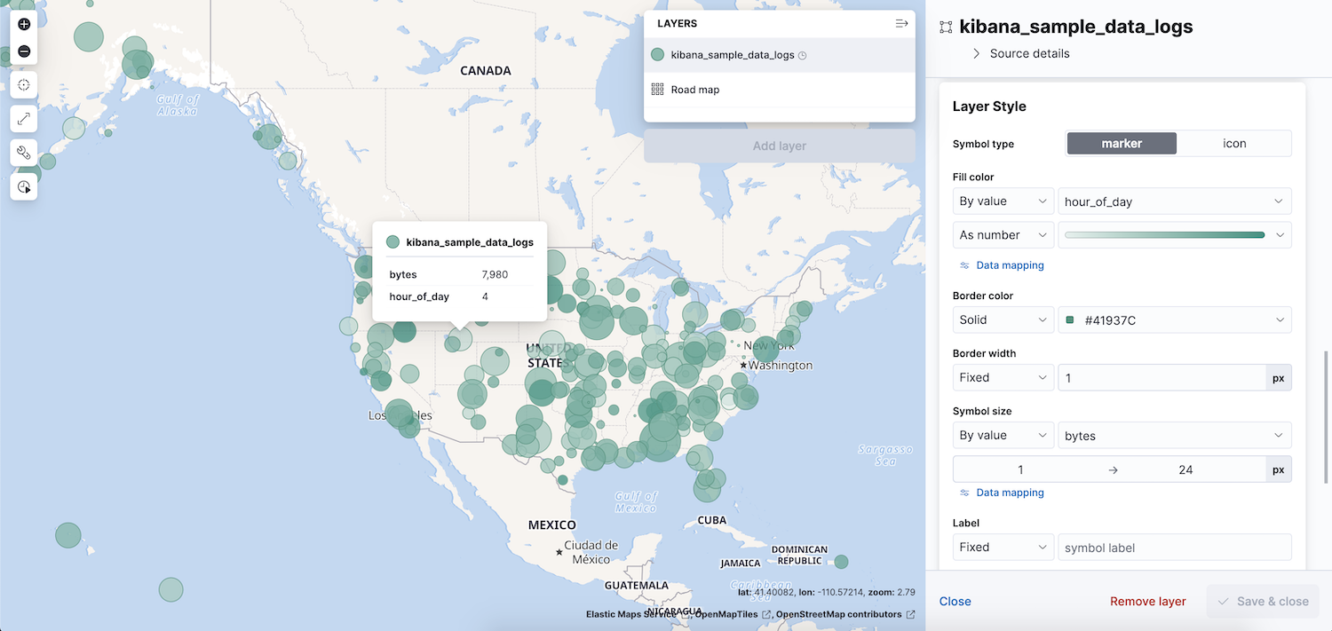 This image shows an example of data driven styling using the Kibana sample web logs data set. The kibana_sample_data_logs layer uses data driven styling for fill color and symbol size style properties.