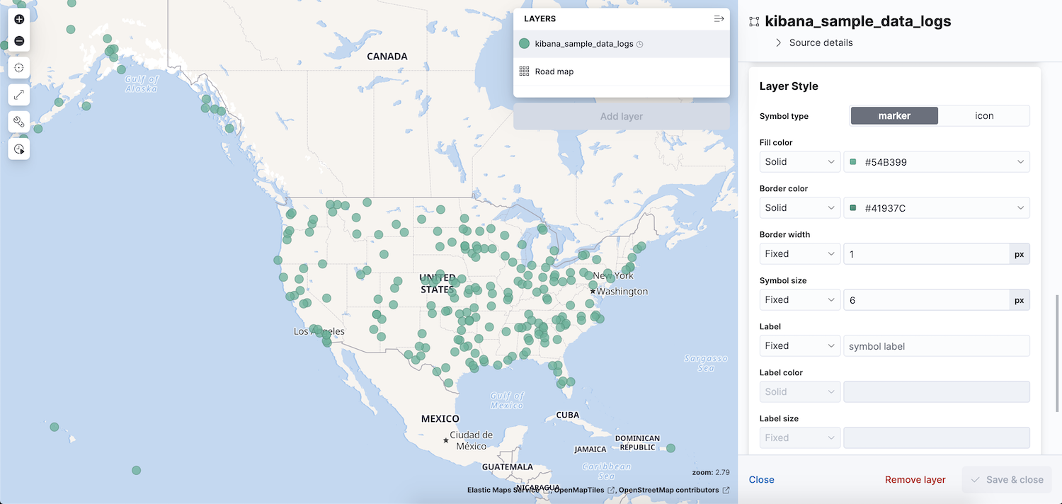 This image shows an example of static styling using the Kibana sample web logs data set. The kibana_sample_data_logs layer uses static styling for all properties.
