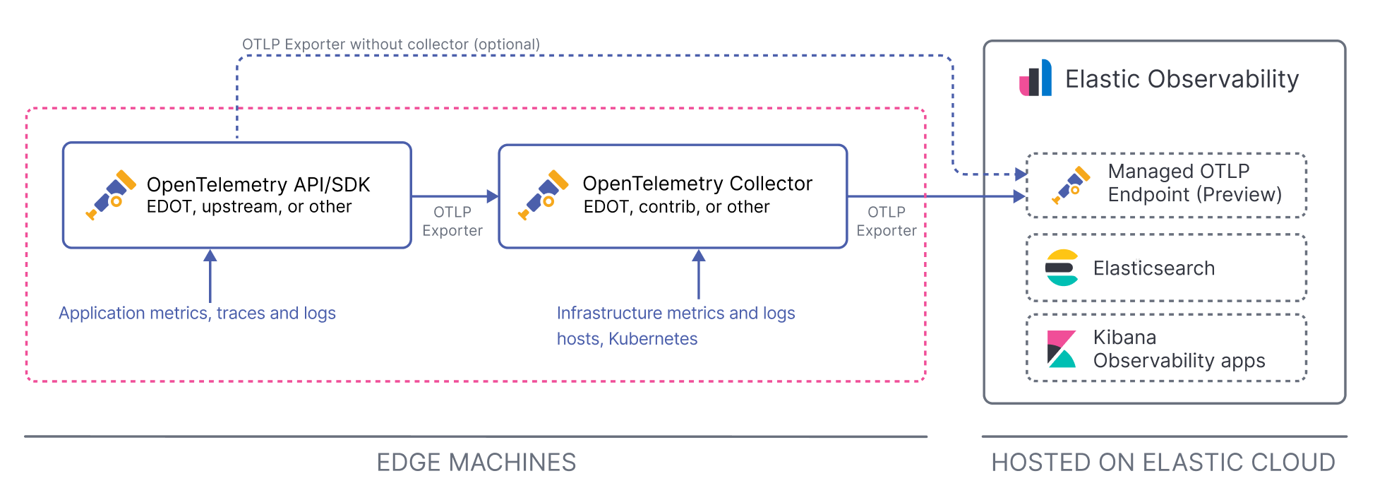 Elastic offers several distributions of OpenTelemetry. Each Elastic Distribution of OpenTelemetry is a customized version of an OpenTelemetry language SDK and the OpenTelemetry Collector, ready to send data to the Managed OTLP endpoint, APM Server, or directly to Elasticsearch.