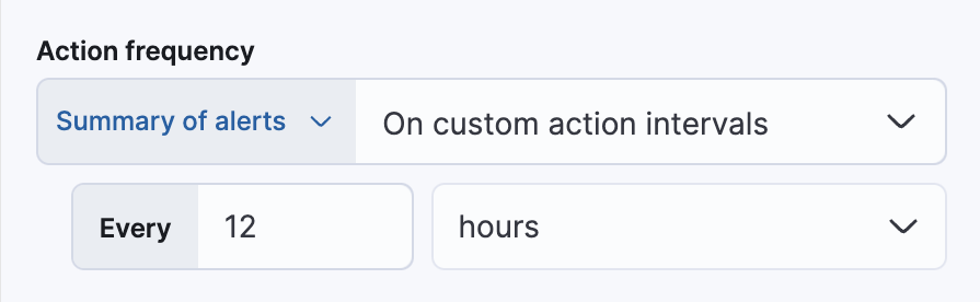 After you select a connector, you must set the action frequency. You can choose to create a summary of alerts on each check interval or on a custom interval. For example, send email notifications that summarize the new, ongoing, and recovered alerts every twelve hours: