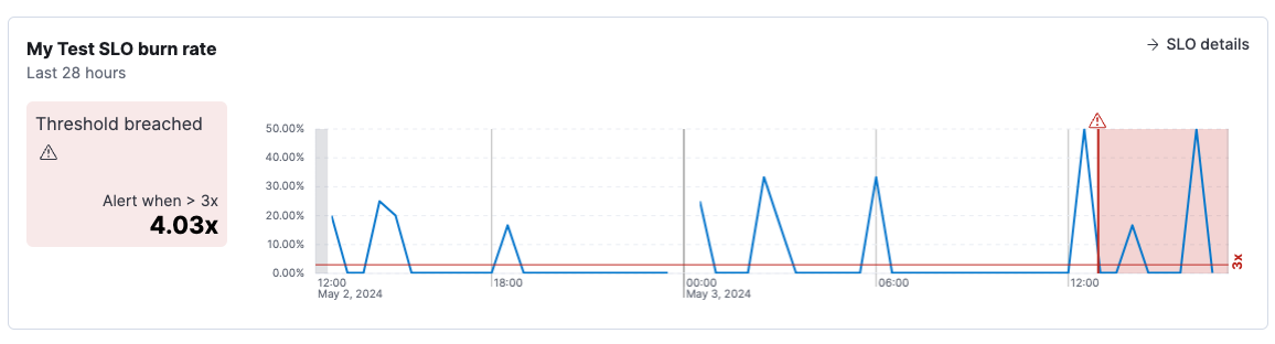 SLO burn rate breaches occur when the percentage of bad events over a specified time period exceeds the threshold set in your SLO burn rate rule. When this happens, you are at risk of exhausting your error budget and violating your SLO.