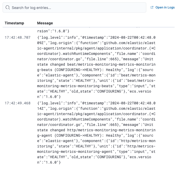 To view the logs in the Logs app for a detailed analysis, click Open in Logs.