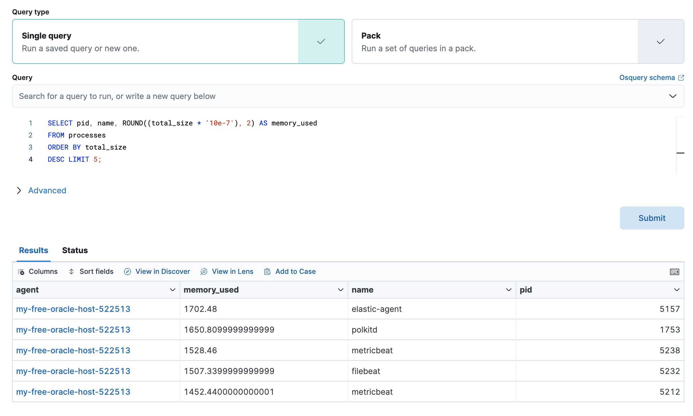 The Osquery tab allows you to build SQL statements to query your host data. You can create and run live or saved queries against the Elastic Agent. Osquery results are stored in Elasticsearch so that you can use the Elastic Stack to search, analyze, and visualize your host metrics. To create saved queries and add scheduled query groups, refer to Osquery.