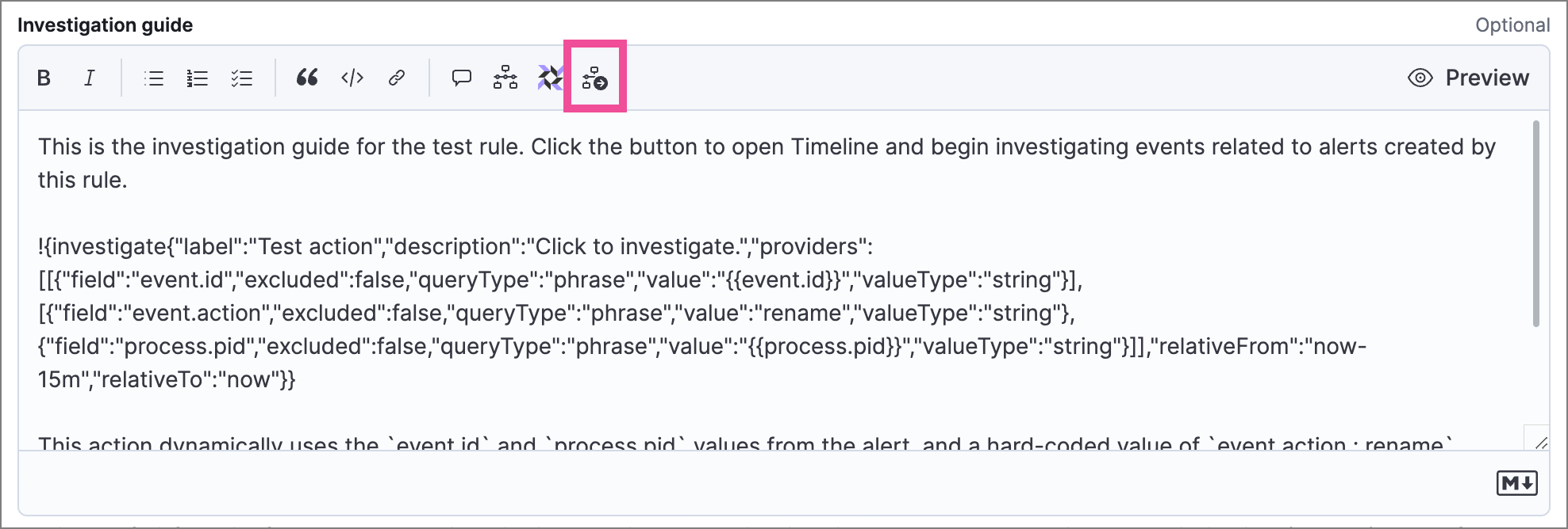 Detection rule investigation guides suggest steps for triaging, analyzing, and responding to potential security issues. For custom rules, you can create an interactive investigation guide that includes buttons for launching runtime queries in Timeline, using alert data and hard-coded literal values. This allows you to start detailed Timeline investigations directly from an alert using relevant data.