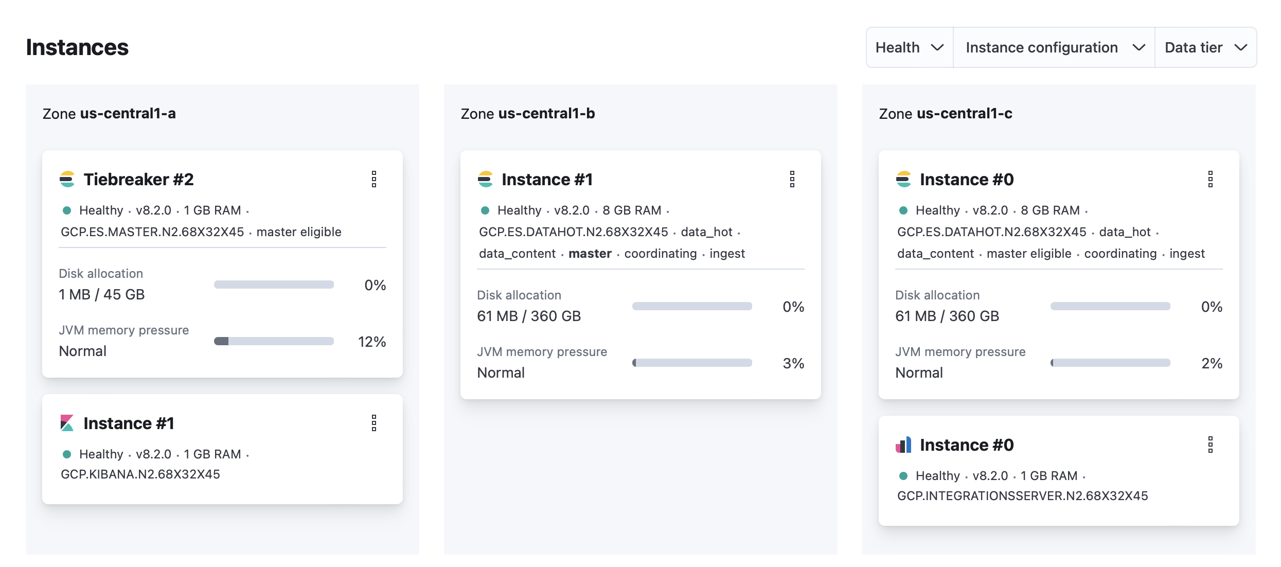 3. On your deployment page, scroll down to Instances and check if the disk allocation for any of your Elasticsearch instances is over 90%.