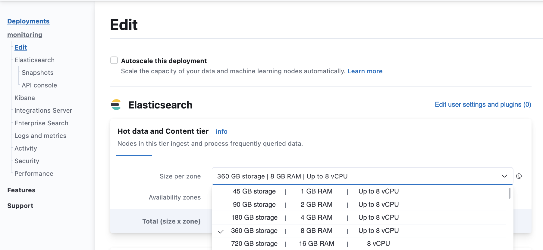 3. From your deployment menu, go to the Edit page and increase the Size per zone for the data tiers identified at step 2.