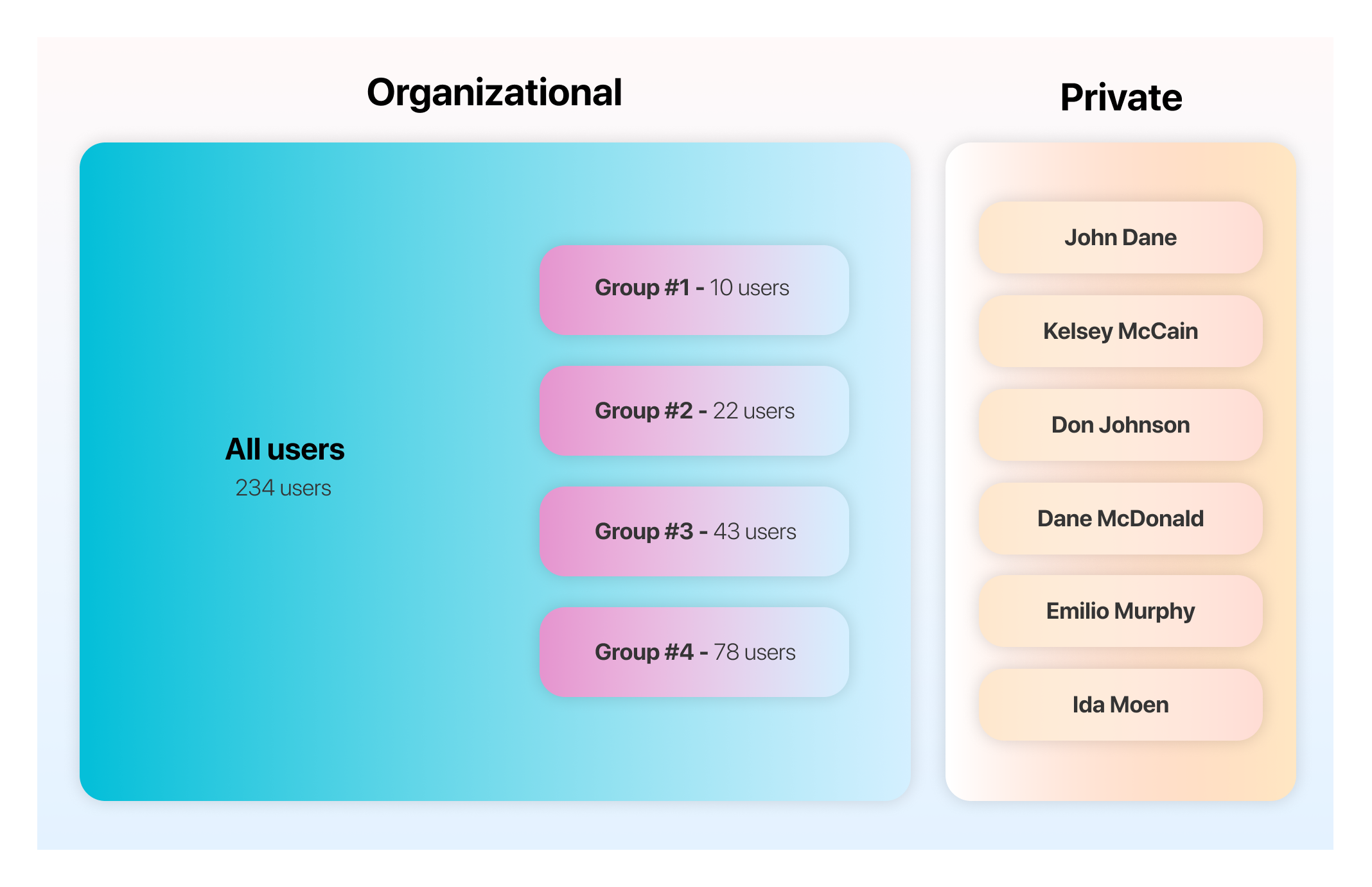 - Organizational source, specific groups: also known as shared sources, connected by an administrative user of Workplace Search, usually with an account with access limited to information or documents generally available to members of a group, like an engineering or marketing team.