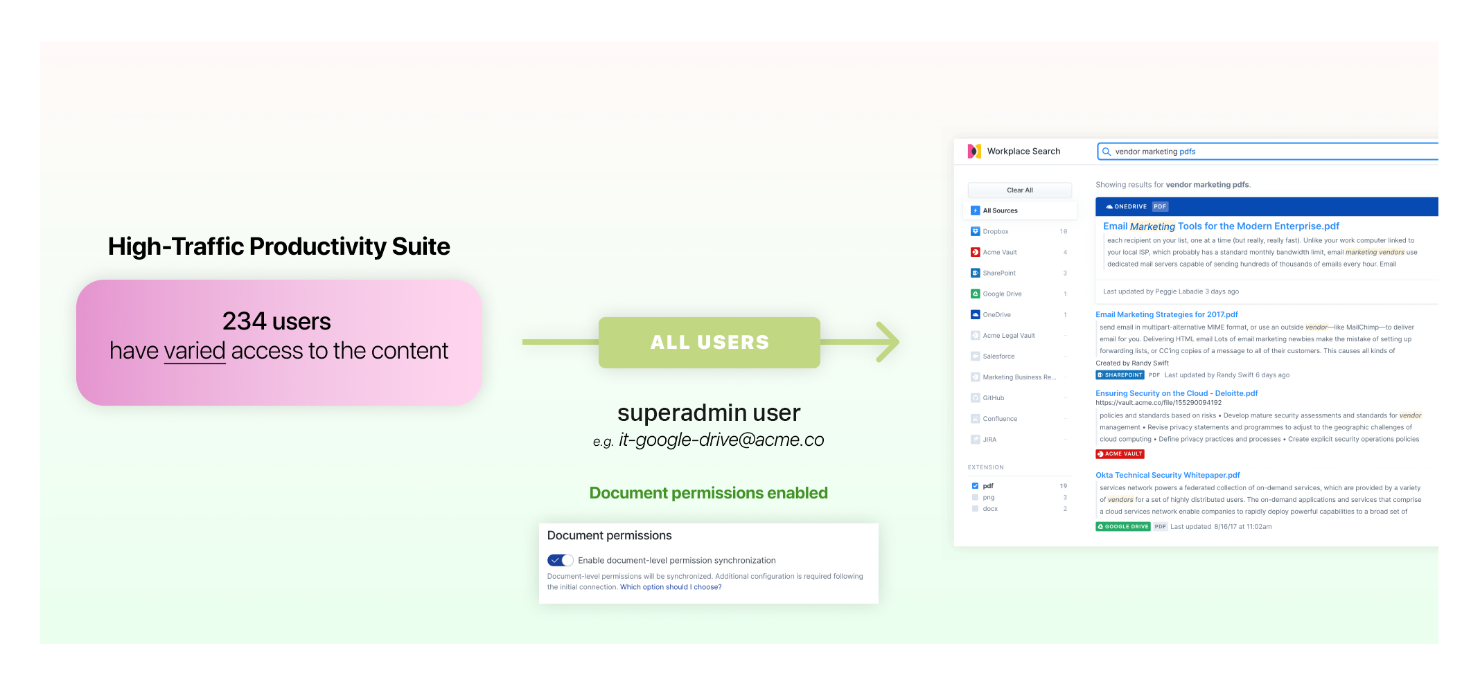 When a superadmin user is used to connect a source that supports document-level access synchronization, all documents found on the platform are indexed, along with access information for each file, record, and document. For documents to be searchable, permission information mapping must be provided via the External Identities API reference. Not all content platforms offer superadmin user privileges.