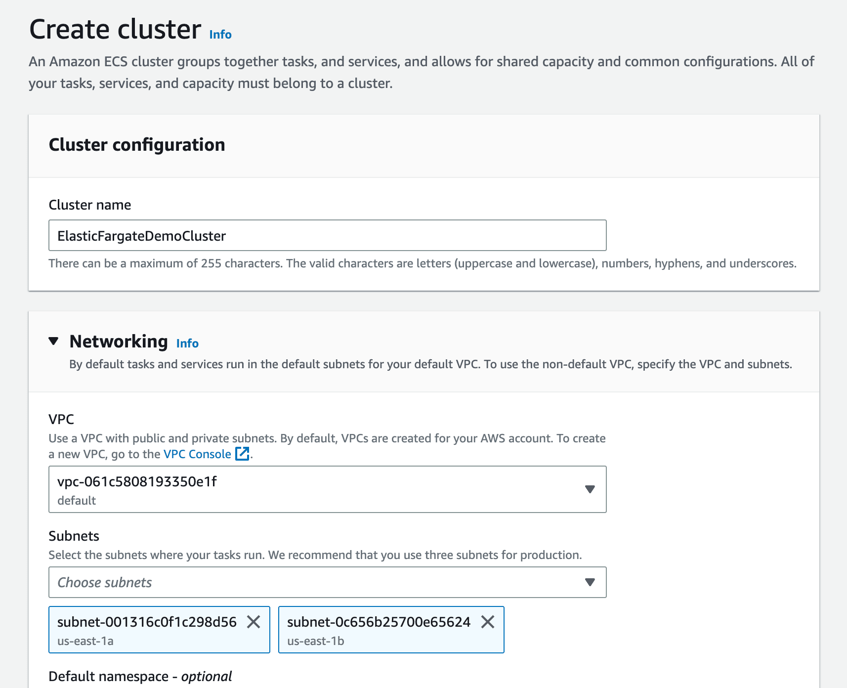 Add a name to the Cluster. And for subnets, only select the first two for us-east-1a and us-eastlb.