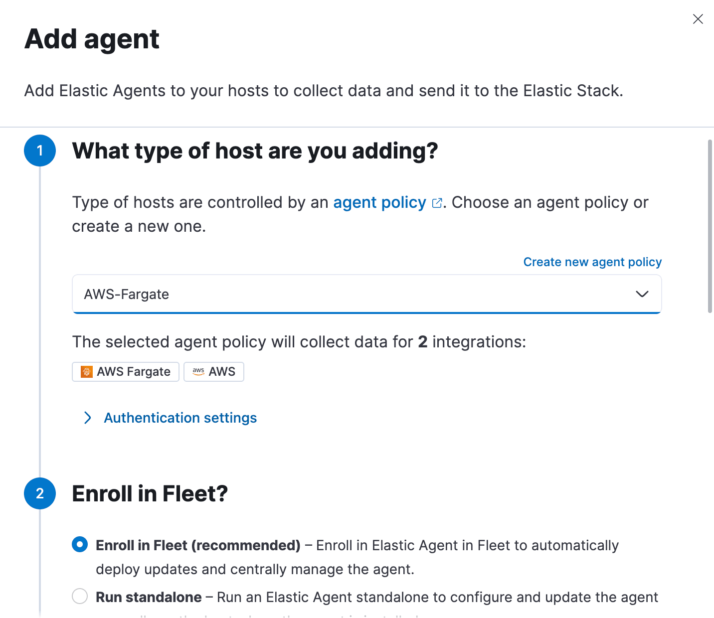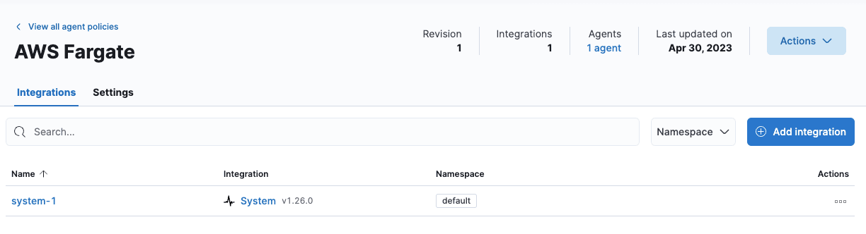Now that we have an agent policy, let’s add the integration to collect logs and metrics from the host. Click on AWS Fargate -> Add integration.