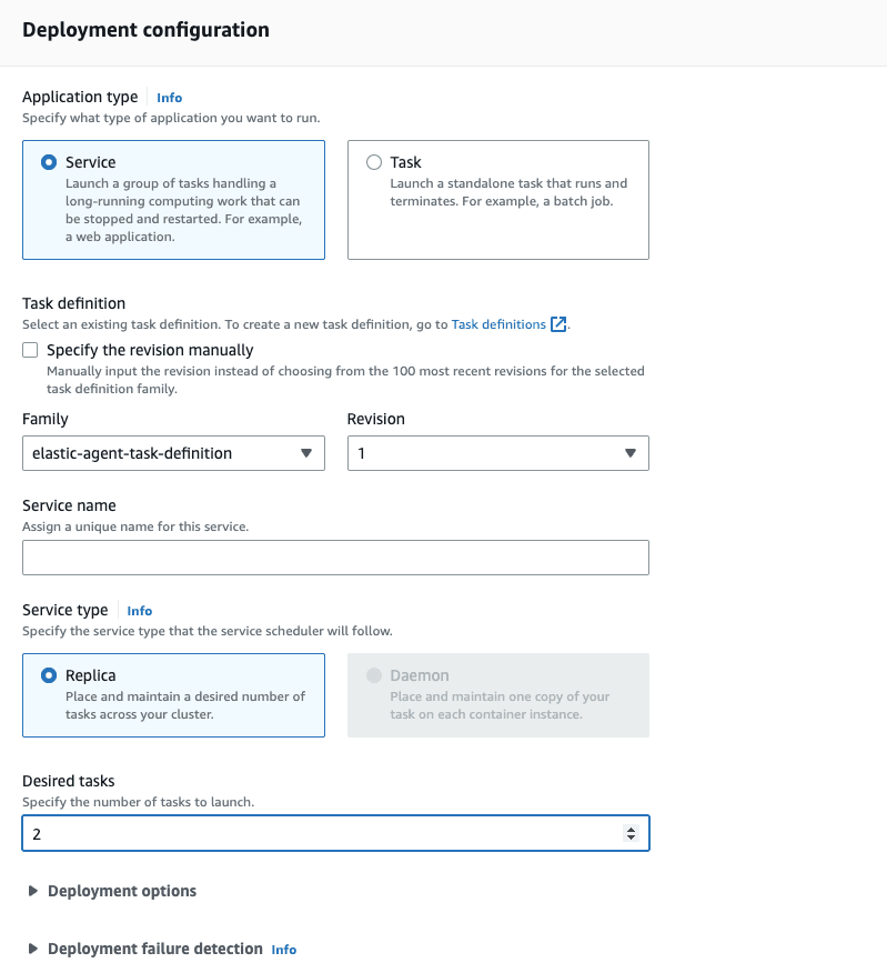 Set up the deployment configuration. Here you should provide the name of the task definition you created in the previous step. Also, provide the service with a unique name. Set the number of desired tasks to 2 instead of 1.