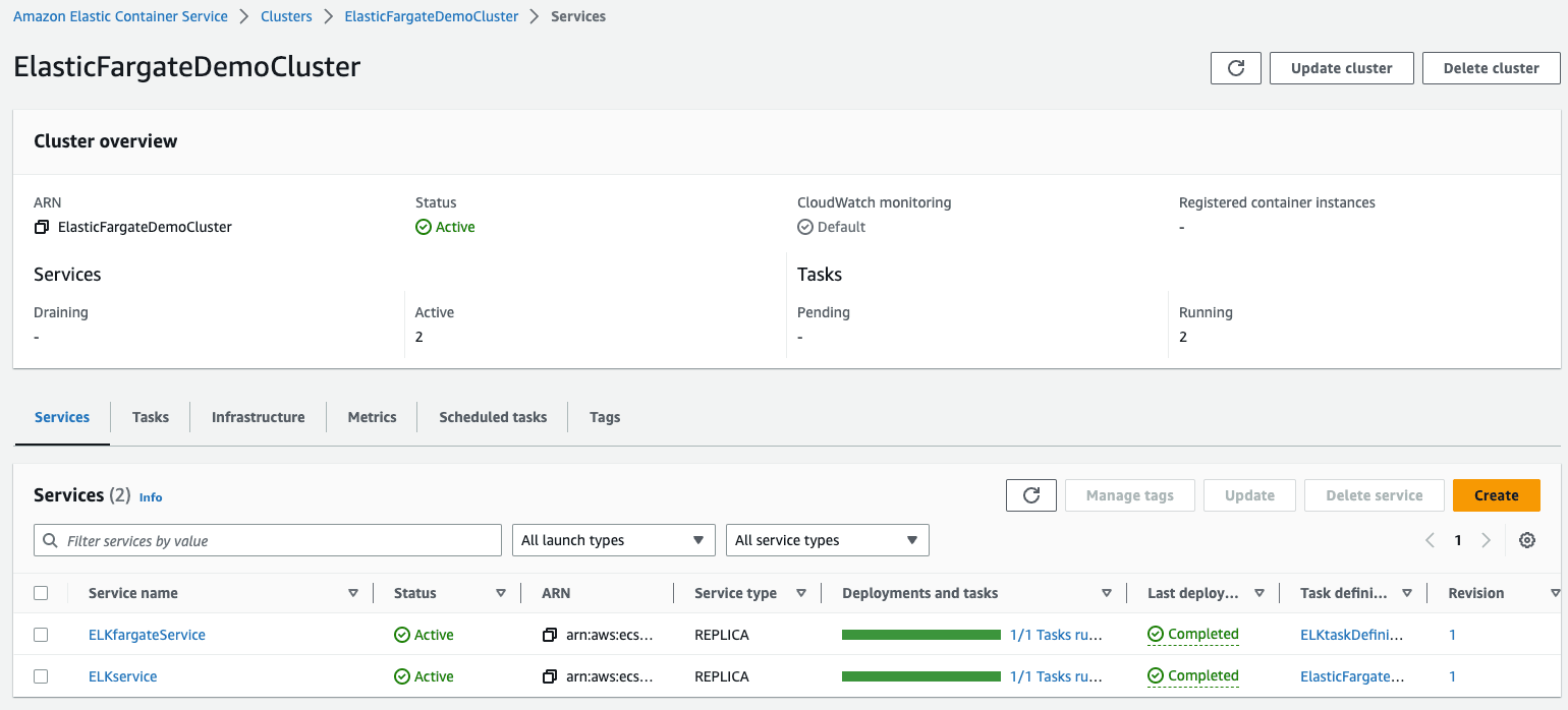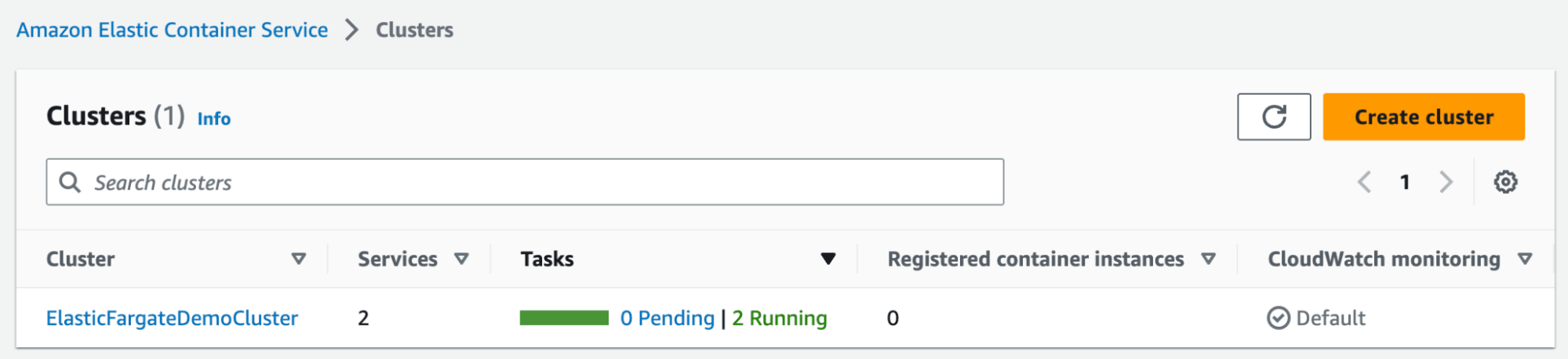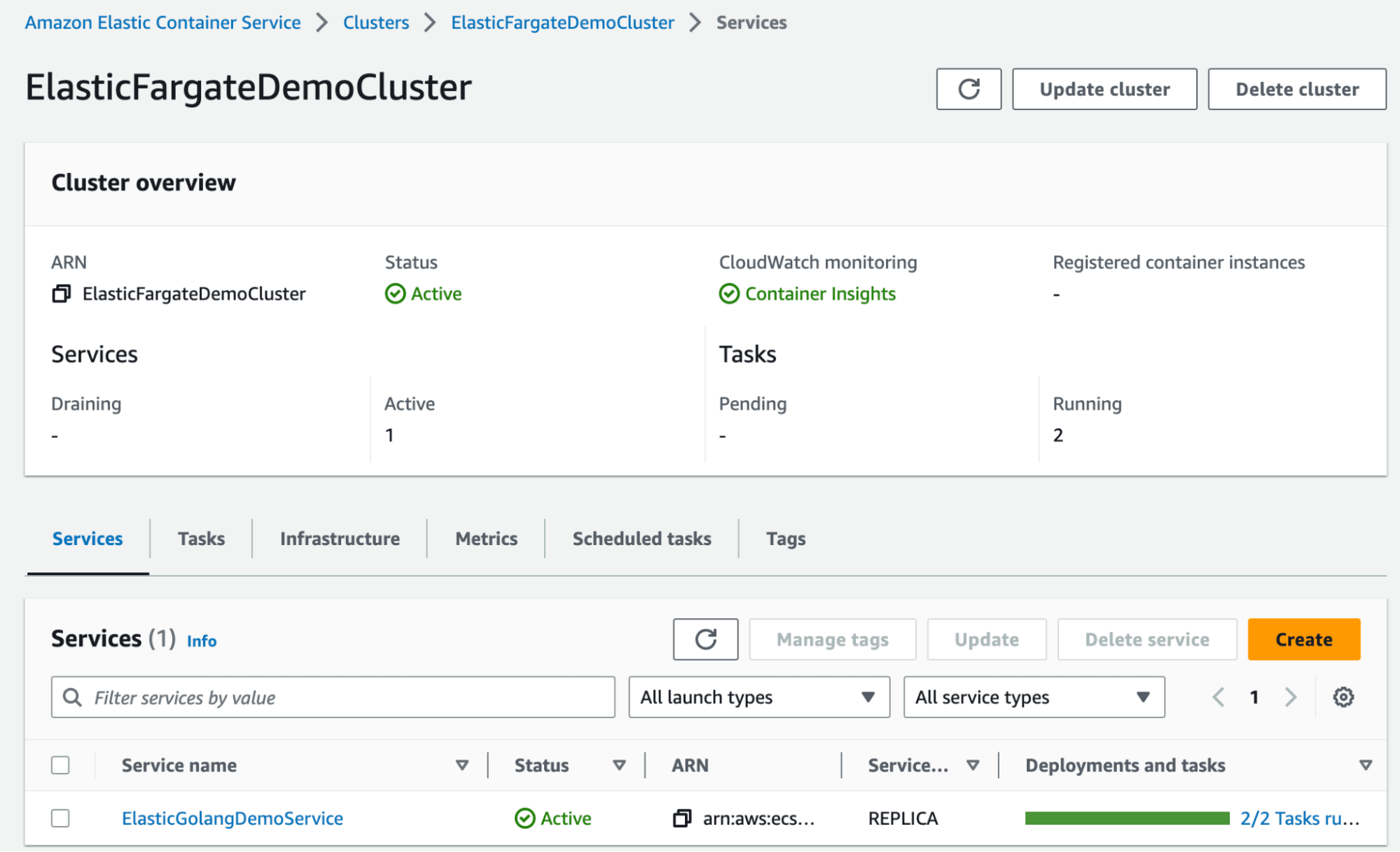 Click Create. Now your service is running two tasks in your cluster using the task definition you provided.