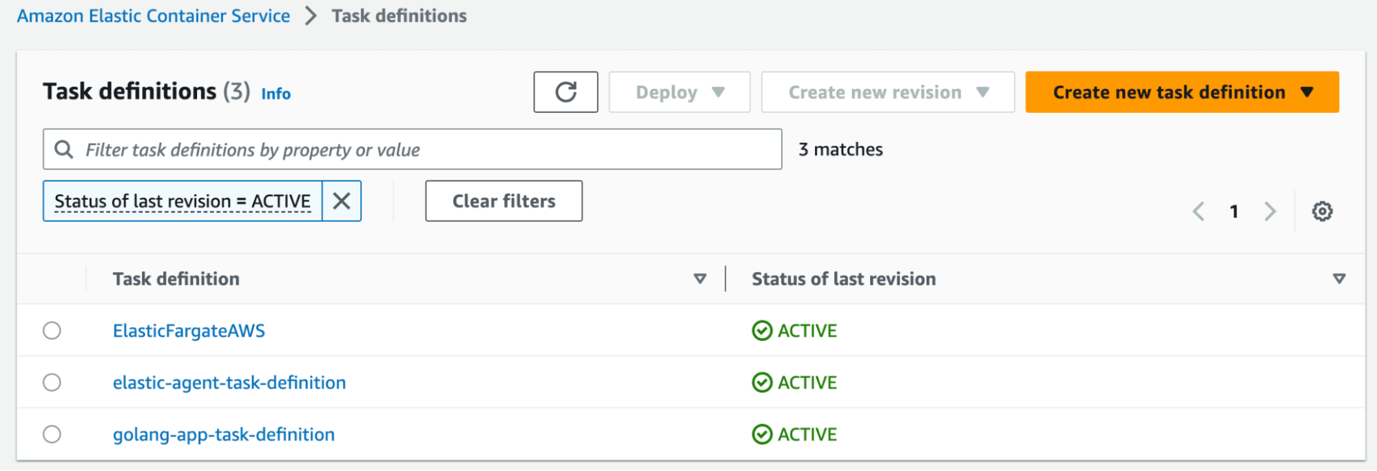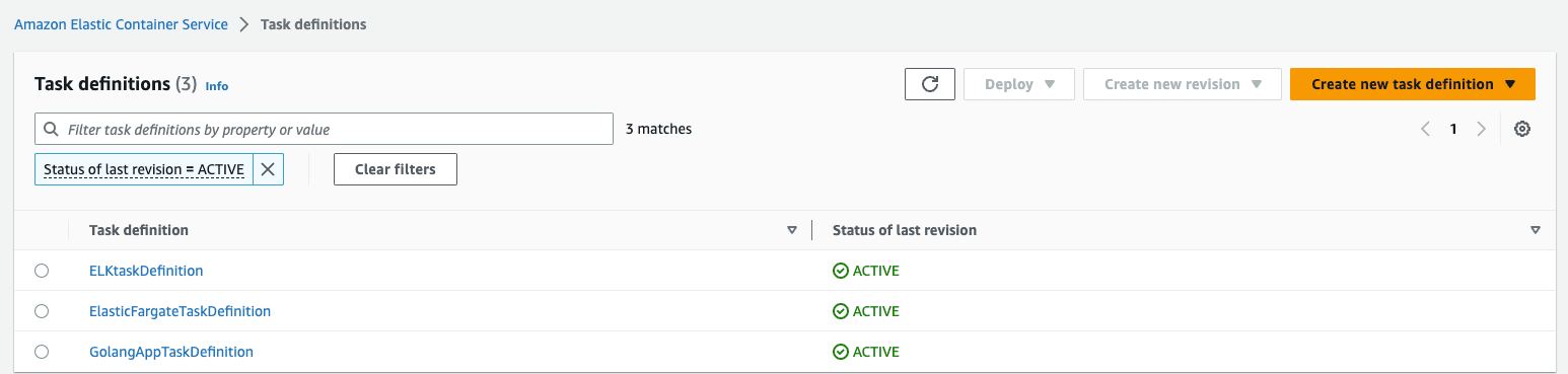 Now it’s time to create the task definition. Navigate to ECS -> Task definitions. Click Create new task definition.