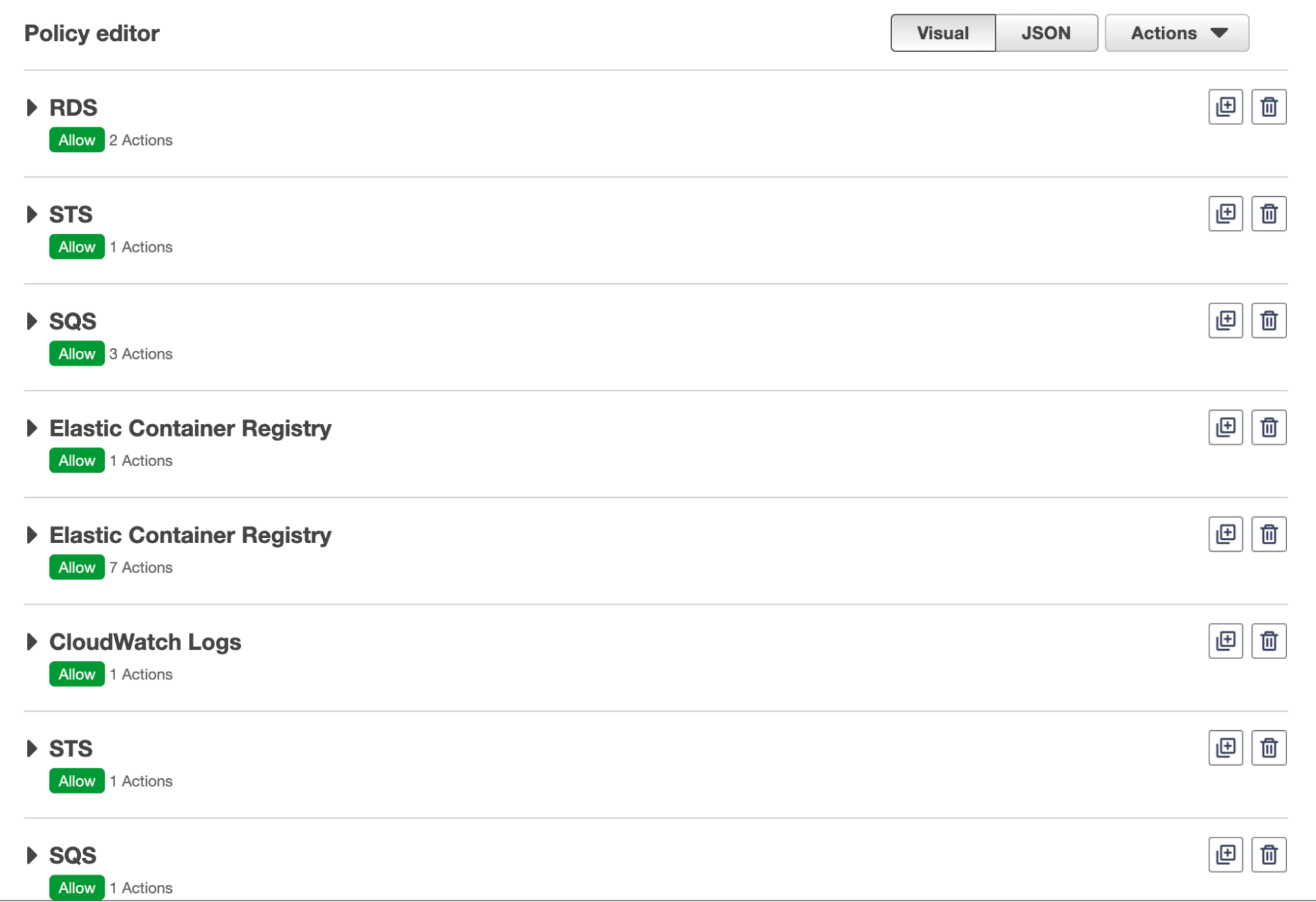 Now we will reference the AWS permissions from the Fleet AWS integration page and use them to configure the policy. In addition to these permissions, we will also add the GetAtuhenticationToken action for ECR.