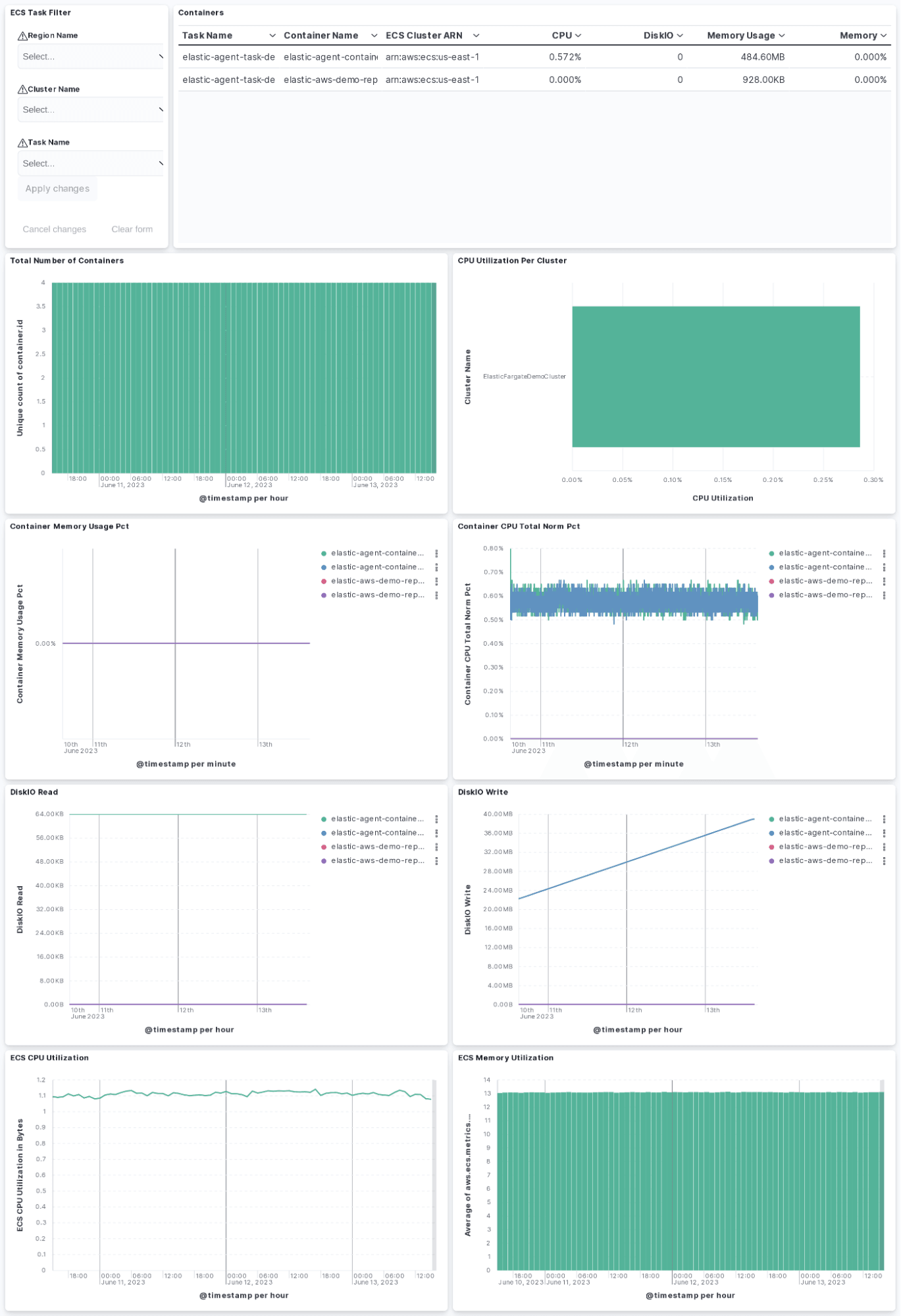 Lastly, we can view the AWS Fargate dashboard generated using the data collected by our Elastic Agent. This is an out-of-the-box dashboard that can also be customized based on the data you would like to visualize.