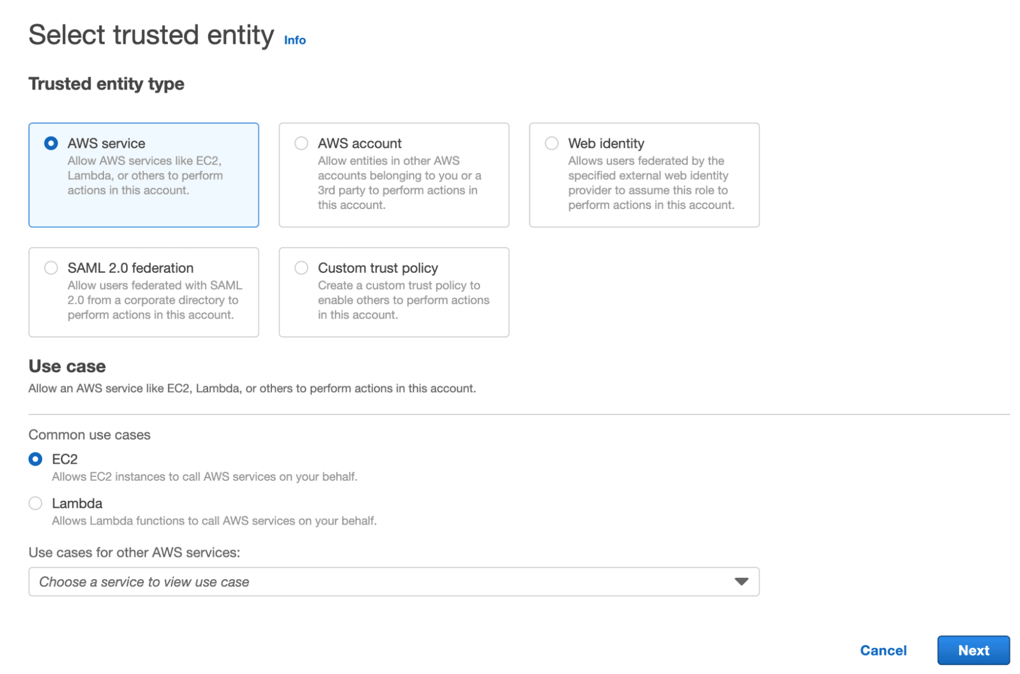 Select AWS service as Trusted entity type and select EC2 as Use case. Click Next.