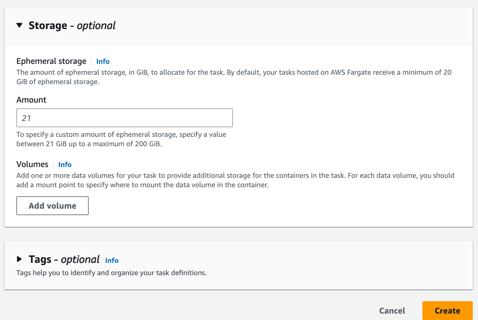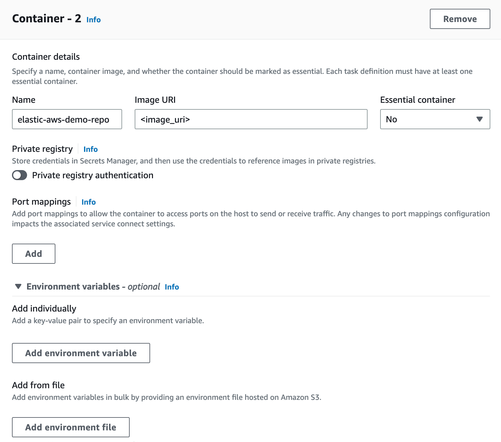 For the sake of the demo, leave Environment, Monitoring, Storage, and Tags as default values. Now we will need to create a second container to run the image for the golang app stored in ECR. Click Add more containers.