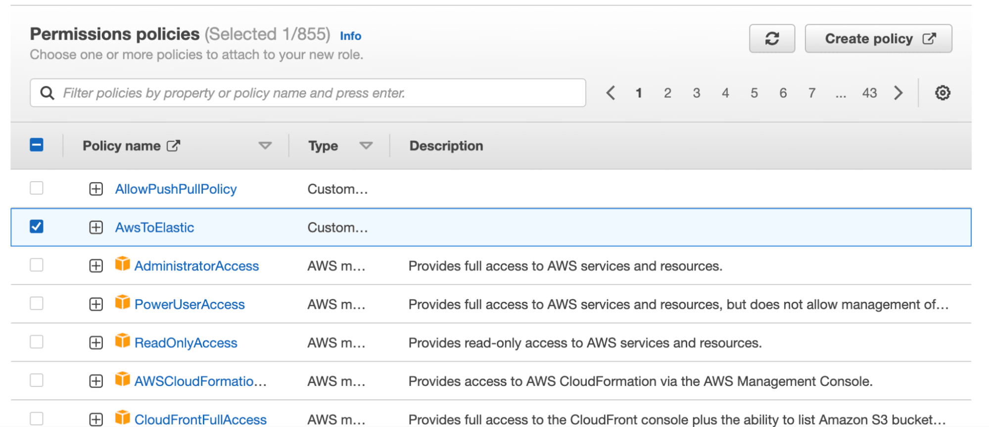 We’ll be adding to the policy AWS to collect overall AWS metrics and AWS Fargate to collect metrics from this integration. You can find each one by typing them in the search bar.