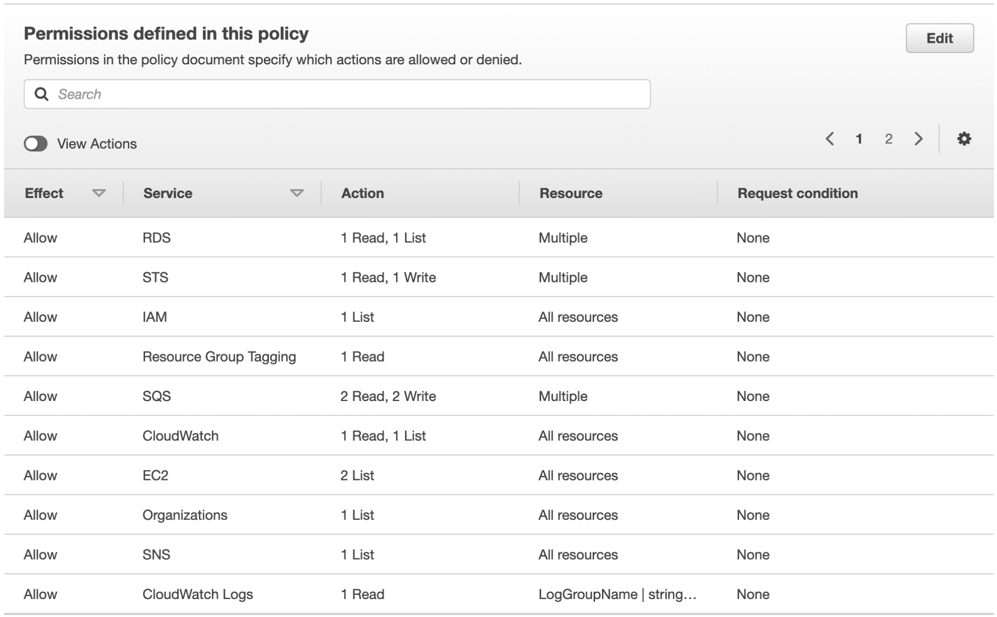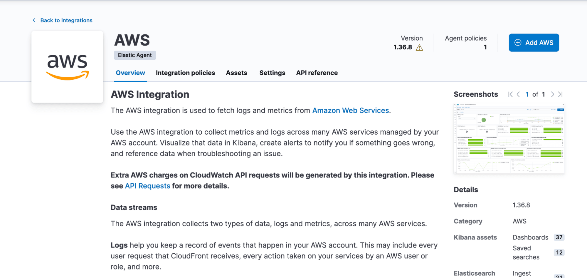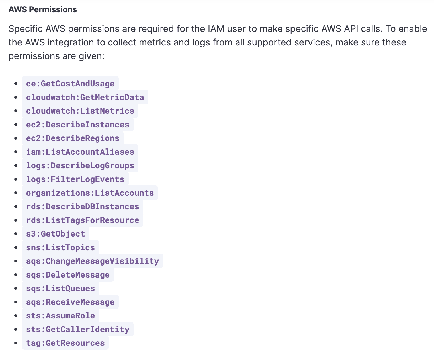 Another thing to keep in mind when using this integration is the set of permissions required to collect data from AWS. This can be found on the AWS integration page under AWS permissions. Take note of these permissions, as we will use them to create an IAM policy.