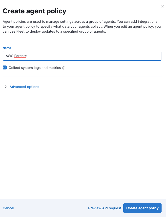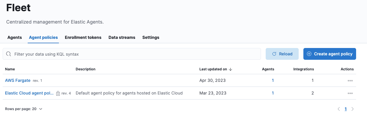 Click Create agent policy. Here we’ll create a policy to attach to the Fleet agent.
