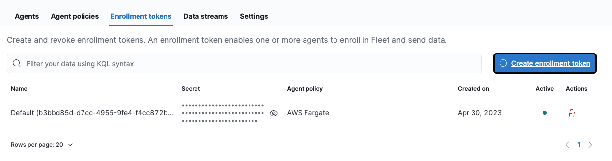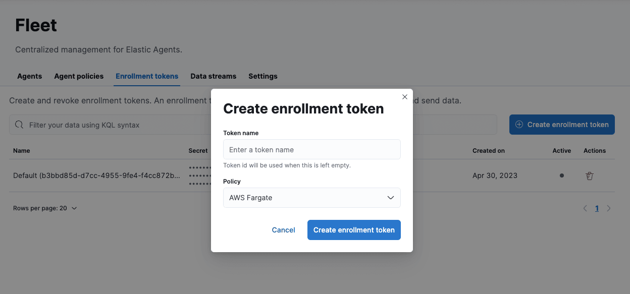 Lastly, let’s create the enrollment token and attach the agent policy. This will enable AWS ECS Fargate to access Elastic and send data.