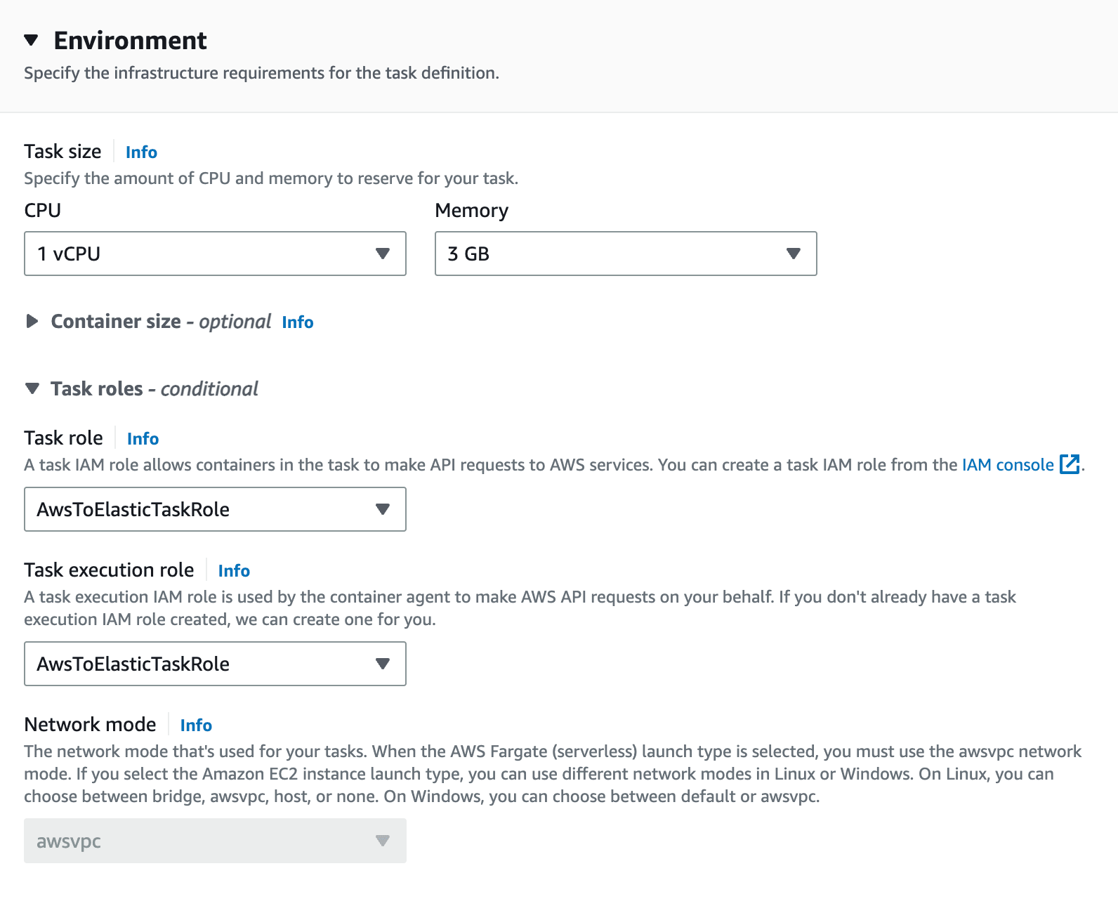 For Environment, we will reserve 1 vCPU and 3 GB of memory. Under Task role, search for the role we created that uses the IAM policy.
