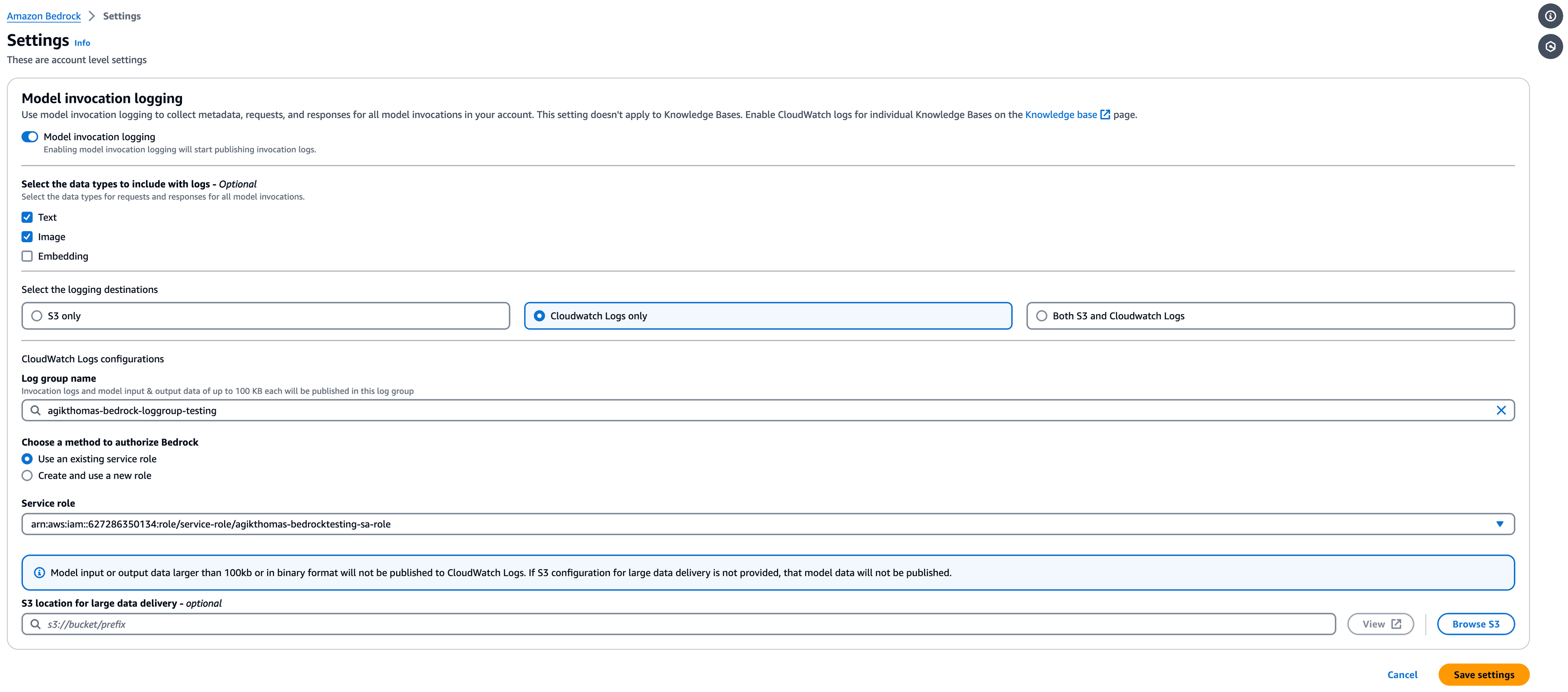 Please visit the AWS Console and navigate to the "Settings" section under Amazon Bedrock and select your preferred method of collecting logs. Based on the value you select from the Logging Destination in the Amazon Bedrock settings, you will need to enter either the Amazon S3 location or the CloudWatch log group ARN.