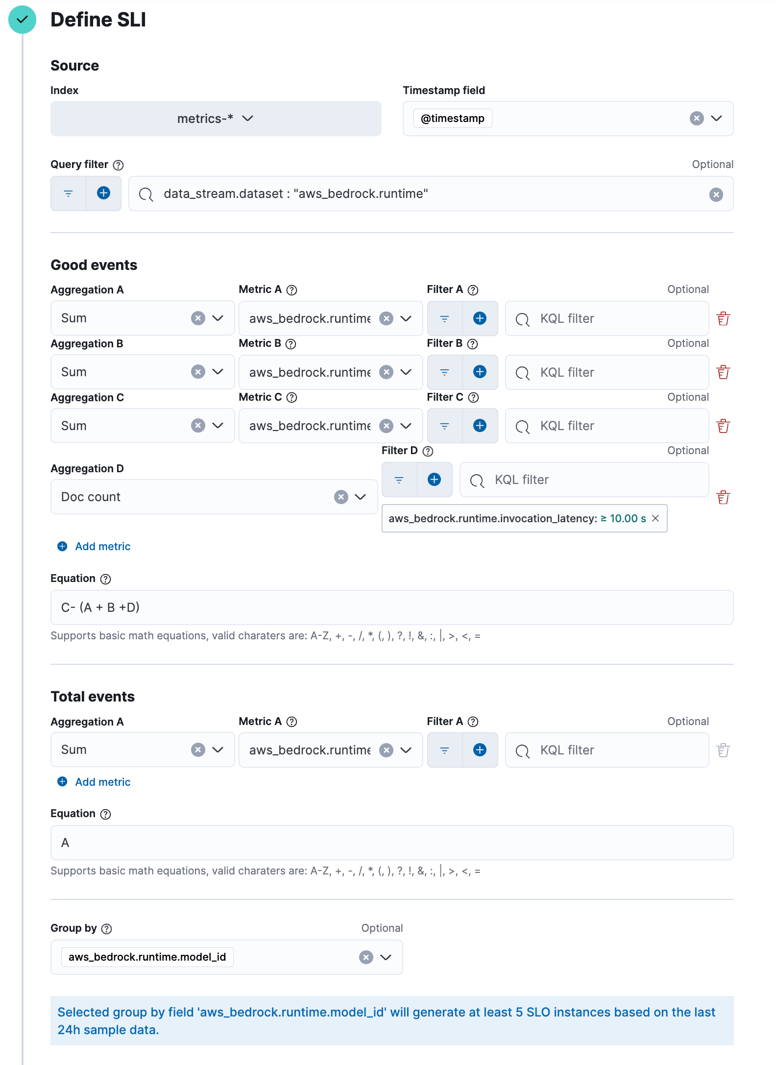Similarly, to create an SLO for monitoring Amazon Bedrock invocation performance for instance, you can define a custom query SLI where good events are those Amazon Bedrock invocations that do not result in client errors or server errors and have latency less than 10 seconds. Set an appropriate SLO target, such as 99%. This will help you identify errors and latency issues in applications using LLMs, allowing you to take timely corrective actions before they affect the overall user experience.